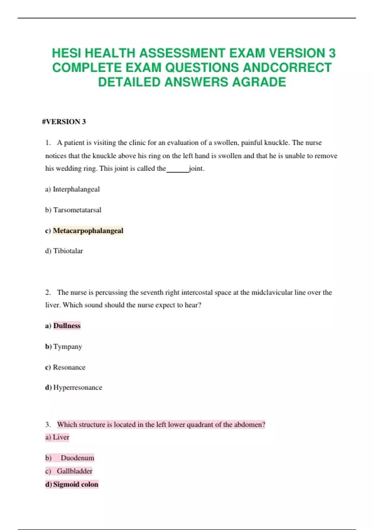 HESI HEALTH ASSESSMENT EXAM VERSION 3 COMPLETE EXAM QUESTIONS ANDCORRECT DETAILED ANSWERS AGRADE