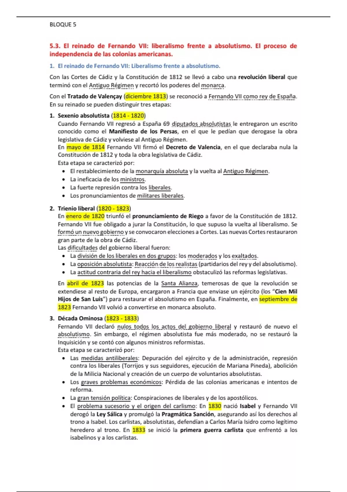 5.3. El reinado de Fernando VII: liberalismo frente a absolutismo. El proceso de