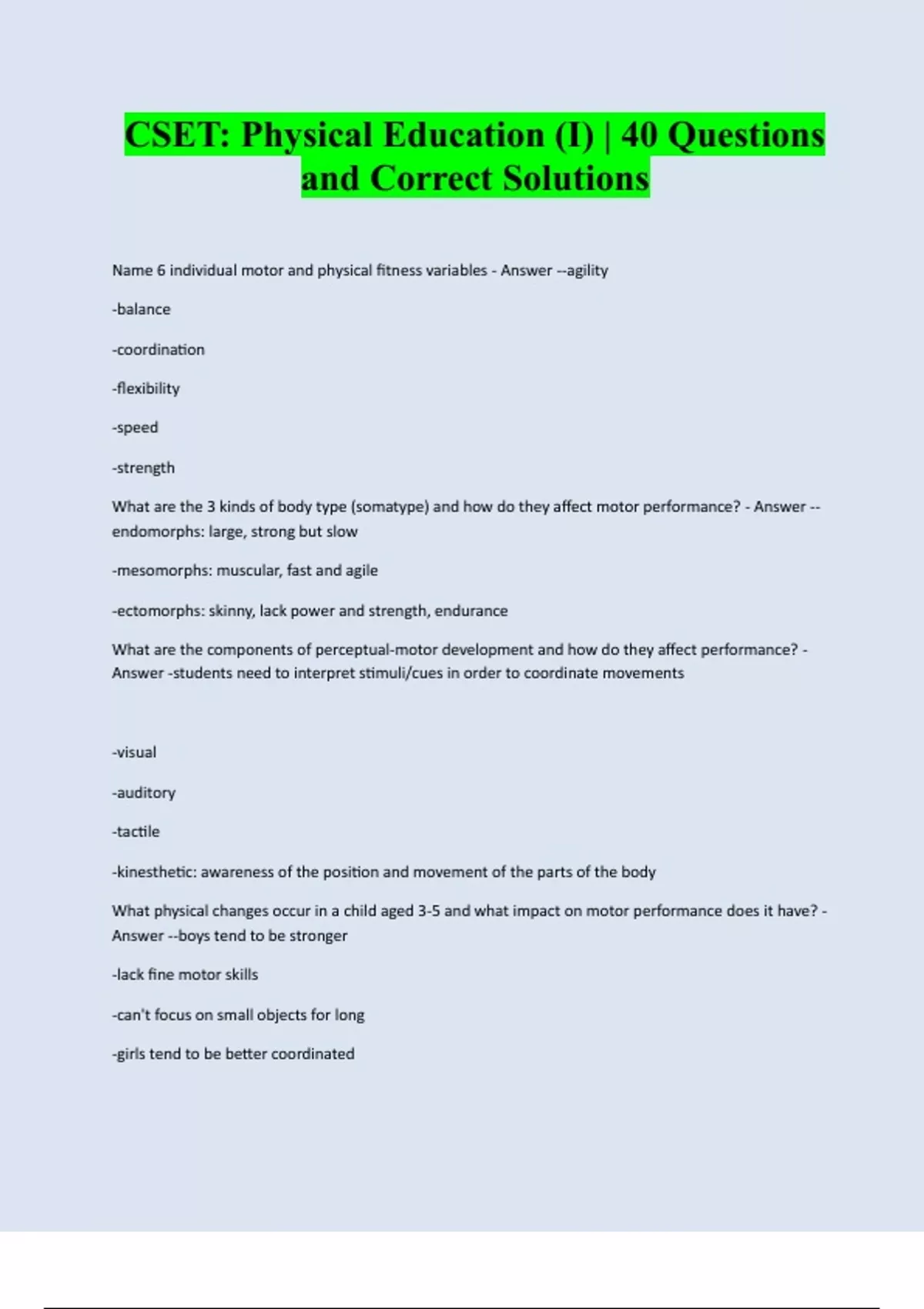 CSET: Physical Education (I) | 40 Questions and Correct Solutions Name 6 individual motor and physical fitness variables - Answer --agility -balance -coordination -flexibility -speed -strength What are the 3 kinds of body type (somatype) and how do they affect motor performance? - Answer -- endomorphs: large, strong but slow -mesomorphs: muscular, fast and agile -ectomorphs: skinny, lack power and strength, endurance What are the components of perceptual-motor development and how do they affect performance? - Answer -students need to interpret stimuli/cues in order to coordinate movements -visual -auditory -tactile -kinesthetic: awareness of the position and movement of the parts of the body What physical changes occur in a child aged 3-5 and what impact on motor performance does it have? - Answer --boys tend to be stronger -lack fine motor skills -can't focus on small objects for lon