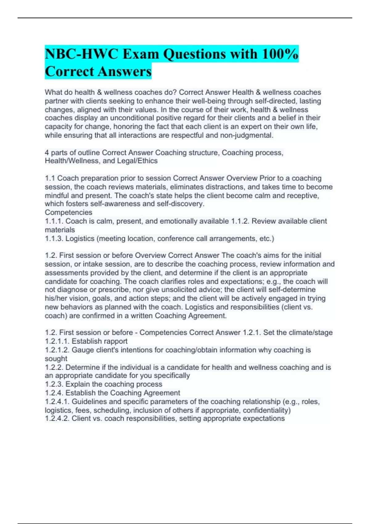 What do health & wellness coaches do? Correct Answer Health & wellness coaches partner with clients seeking to enhance their well-being through self-directed, lasting changes, aligned with their values. In the course of their work, health & wellness coaches display an unconditional positive regard for their clients and a belief in their capacity for change, honoring the fact that each client is an expert on their own life, while ensuring that all interactions are respectful and non-judgmental. 4 parts of outline Correct Answer Coaching structure, Coaching process, Health/Wellness, and Legal/Ethics 1.1 Coach preparation prior to session Correct Answer Overview Prior to a coaching session, the coach reviews materials, eliminates distractions, and takes time to become mindful and present. The coach's state helps the client become calm and receptive, which fosters self-awareness and self-discovery. Competencies 1.1.1. Coach is calm, present, and emotionally available 1.1.2. Review available client materials 1.1.3. Logistics (meeting location, conference call arrangements, etc.) 1.2. First session or before Overview Correct Answer The coach's aims for the initial session, or intake session, are to describe the coaching process, review information and assessments provided by the client, and determine if the client is an appropriate candidate for coaching. The coach clarifies roles and expectations; e.g., the coach will not diagnose or prescribe, nor give unsolicited advice; the client will self-determine his/her vision, goals, and action steps; and the client will be actively engaged in trying new behaviors as planned with the coach. Logistics and responsibilities (client vs. coach) are confirmed in a written Coaching Agreement. 1.2. First session or before - Competencies Correct Answer 1.2.1. Set the climate/stage 1.2.1.1. Establish rapport 1.2.1.2. Gauge client's intentions for coaching/obtain information why coaching is sought 1.2.2. Determine if the individual is a candidate for health and wellness coaching and is an appropriate candidate for you specifically 1.2.3. Explain the coaching process 1.2.4. Establish the Coaching Agreement 1.2.4.1. Guidelines and specific parameters of the coaching relationship (e.g., roles, logistics, fees, scheduling, inclusion of others if appropriate, confidentiality) 1.2.4.2. Client vs. coach responsibilities, setting appropriate expectations