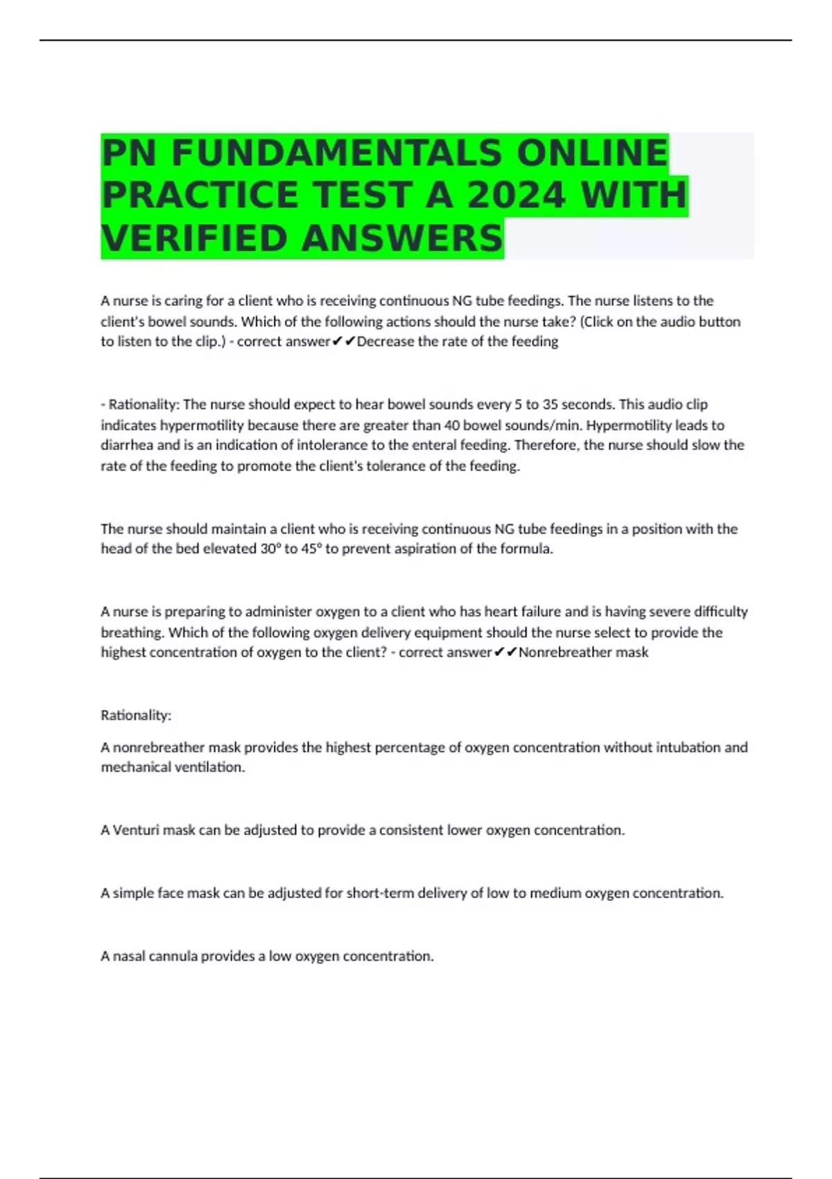 PN FUNDAMENTALS ONLINE PRACTICE TEST A 2024 WITH VERIFIED ANSWERS