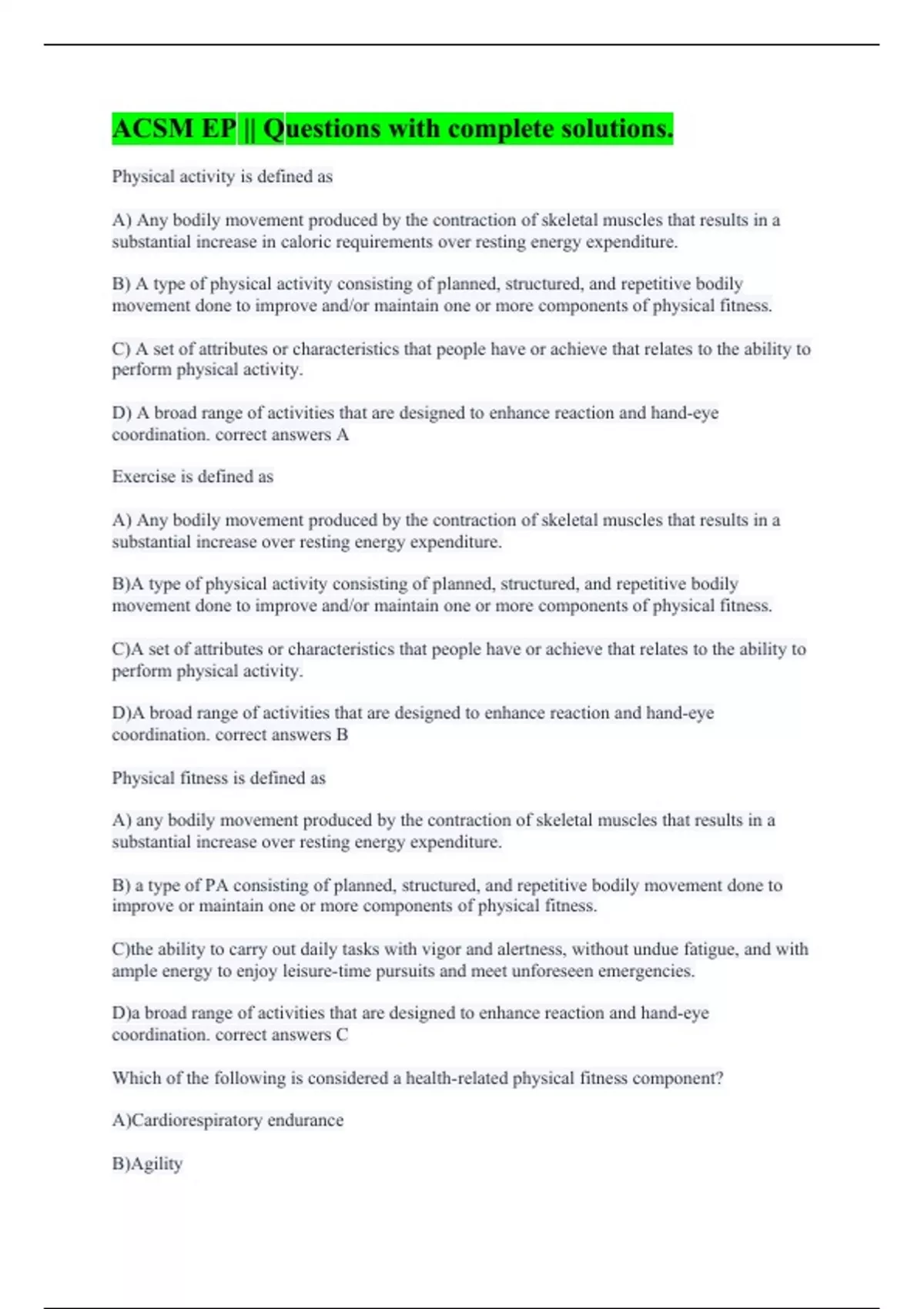Physical activity is defined as A) Any bodily movement produced by the contraction of skeletal muscles that results in a substantial increase in caloric requirements over resting energy expenditure. B) A type of physical activity consisting of planned, structured, and repetitive bodily movement done to improve and/or maintain one or more components of physical fitness. C) A set of attributes or characteristics that people have or achieve that relates to the ability to perform physical activity. D) A broad range of activities that are designed to enhance reaction and hand-eye coordination. correct answers A Exercise is defined as A) Any bodily movement produced by the contraction of skeletal muscles that results in a substantial increase over resting energy expenditure. B)A type of physical activity consisting of planned, structured, and repetitive bodily movement done to improve and/or maintain one or more components of physical fitness. C)A set of attributes or characteristics that people have or achieve that relates to the ability to perform physical activity. D)A broad range of activities that are designed to enhance reaction and hand-eye coordination. correct answers B Physical fitness is defined as A) any bodily movement produced by the contraction of skeletal muscles that results in a substantial increase over resting energy expenditure. B) a type of PA consisting of planned, structured, and repetitive bodily movement done to improve or maintain one or more components of physical fitness. C)the ability to carry out daily tasks with vigor and alertness, without undue fatigue, and with ample energy to enjoy leisure-time pursuits and meet unforeseen emergencies. D)a broad range of activities that are designed to enhance reaction and hand-eye coordination. correct answers C Which of the following is considered a health-related physical fitness component? A)Cardiorespiratory endurance B)Agility