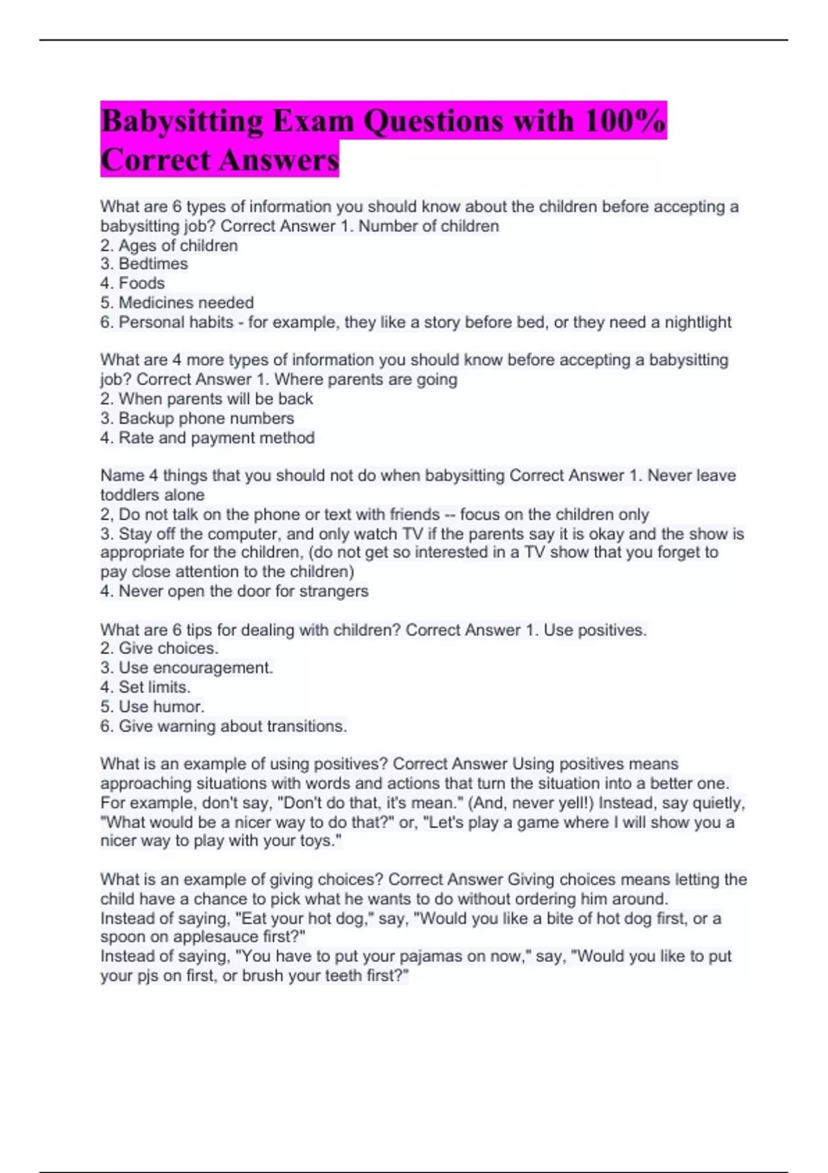 What are 6 types of information you should know about the children before accepting a babysitting job? Correct Answer 1. Number of children 2. Ages of children 3. Bedtimes 4. Foods 5. Medicines needed 6. Personal habits - for example, they like a story before bed, or they need a nightlight What are 4 more types of information you should know before accepting a babysitting job? Correct Answer 1. Where parents are going 2. When parents will be back 3. Backup phone numbers 4. Rate and payment method Name 4 things that you should not do when babysitting Correct Answer 1. Never leave toddlers alone 2, Do not talk on the phone or text with friends -- focus on the children only 3. Stay off the computer, and only watch TV if the parents say it is okay and the show is appropriate for the children, (do not get so interested in a TV show that you forget to pay close attention to the children) 4. Never open the door for strangers What are 6 tips for dealing with children? Correct Answer 1. Use positives. 2. Give choices. 3. Use encouragement. 4. Set limits. 5. Use humor. 6. Give warning about transitions. What is an example of using positives? Correct Answer Using positives means approaching situations with words and actions that turn the situation into a better one. For example, don't say, "Don't do that, it's mean." (And, never yell!) Instead, say quietly, "What would be a nicer way to do that?" or, "Let's play a game where I will show you a nicer way to play with your toys." What is an example of giving choices? Correct Answer Giving choices means letting the child have a chance to pick what he wants to do without ordering him around. Instead of saying, "Eat your hot dog," say, "Would you like a bite of hot dog first, or a spoon on applesauce first?" Instead of saying, "You have to put your pajamas on now," say, "Would you like to put your pjs on first, or brush your teeth first?"