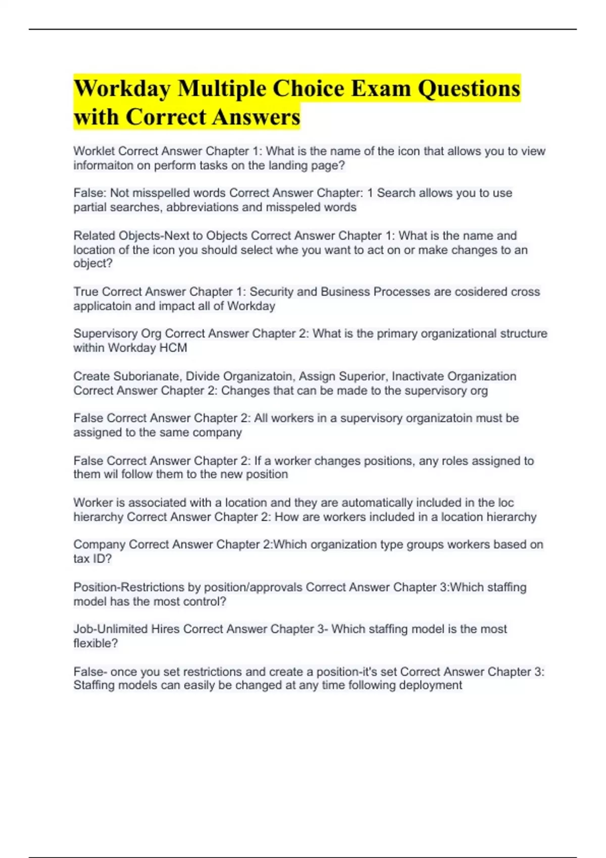 Worklet Correct Answer Chapter 1: What is the name of the icon that allows you to view informaiton on perform tasks on the landing page? False: Not misspelled words Correct Answer Chapter: 1 Search allows you to use partial searches, abbreviations and misspeled words Related Objects-Next to Objects Correct Answer Chapter 1: What is the name and location of the icon you should select whe you want to act on or make changes to an object? True Correct Answer Chapter 1: Security and Business Processes are cosidered cross applicatoin and impact all of Workday Supervisory Org Correct Answer Chapter 2: What is the primary organizational structure within Workday HCM Create Suborianate, Divide Organizatoin, Assign Superior, Inactivate Organization Correct Answer Chapter 2: Changes that can be made to the supervisory org False Correct Answer Chapter 2: All workers in a supervisory organizatoin must be assigned to the same company False Correct Answer Chapter 2: If a worker changes positions, any roles assigned to them wil follow them to the new position Worker is associated with a location and they are automatically included in the loc hierarchy Correct Answer Chapter 2: How are workers included in a location hierarchy Company Correct Answer Chapter 2:Which organization type groups workers based on tax ID? Position-Restrictions by position/approvals Correct Answer Chapter 3:Which staffing model has the most control? Job-Unlimited Hires Correct Answer Chapter 3- Which staffing model is the most flexible? False- once you set restrictions and create a position-it's set Correct Answer Chapter 3: Staffing models can easily be changed at any time following deployment