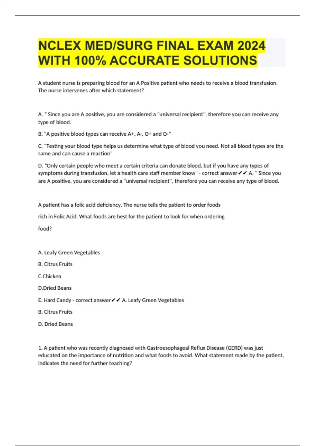 NCLEX MED/SURG FINAL EXAM 2024 WITH 100% ACCURATE SOLUTIONS A student nurse is preparing blood for an A Positive patient who needs to receive a blood transfusion. The nurse intervenes after which statement? A. " Since you are A positive, you are considered a "universal recipient", therefore you can receive any type of blood. B. "A positive blood types can receive A+, A-, O+ and O-" C. "Testing your blood type helps us determine what type of blood you need. Not all blood types are the same and can cause a reaction" D. "Only certain people who meet a certain criteria can donate blood, but if you have any types of symptoms during transfusion, let a health care staff member know" - correct answer A. " Since you are A positive, you are considered a "universal recipient", therefore you can receive any type of blood. A patient has a folic acid deficiency. The nurse tells the patient to order foods rich in Folic Acid. What foods are best for the patient to look for when ordering food? A. Leafy Green Vegetables B. Citrus Fruits C.Chicken D.Dried Beans E. Hard Candy - correct answer A. Leafy Green Vegetables