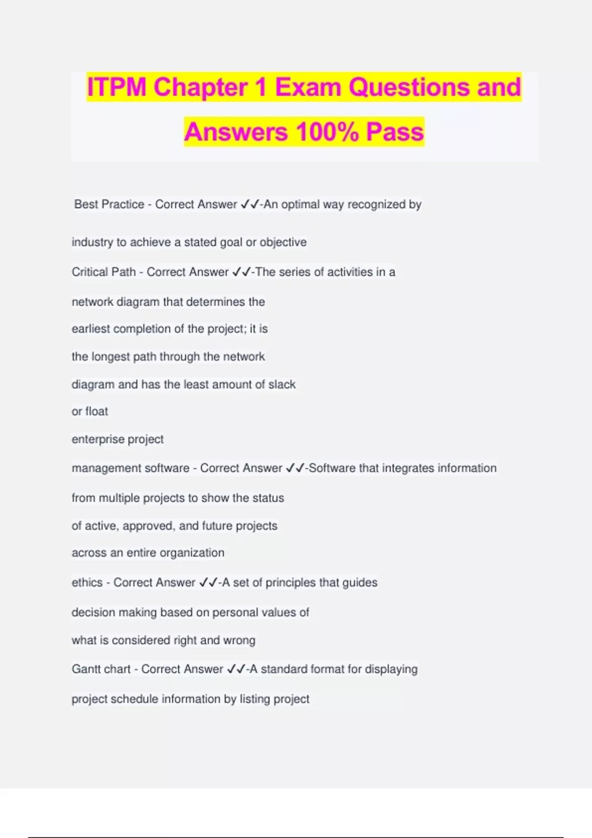 ITPM Chapter 1 Exam Questions and Answers 100% Pass Best Practice - Correct Answer ️️ -An optimal way recognized by industry to achieve a stated goal or objective Critical Path - Correct Answer ️️ -The series of activities in a network diagram that determines the earliest completion of the project; it is the longest path through the network diagram and has the least amount of slack or float enterprise project management software - Correct Answer ️️ -Software that integrates information from multiple projects to show the status of active, approved, and future projects across an entire organization ethics - Correct Answer ️️ -A set of principles that guides decision making based on personal values of what is considered right and wrong Gantt chart - Correct Answer ️️ -A standard format for displaying project schedule information by listing project activities and their corresponding start and finish dates in a calendar format leader - Correct Answer ️️ -A person who focuses on long-term goals and big-picture objectives while inspiring people to reach those goals manager - Correct Answer ️️ -A person who deals with the day-to-day details of meeting specific goals program - Correct Answer ️️ -A group of related projects, subprograms, and program activities managed in a coordinated way to obtain benefits and control not available from managing them individually program manager - Correct Answer ️️ -A person who provides leadership and direction for the project managers heading the projects within a program project - Correct Answer ️️ -A temporary endeavor undertaken to create a unique product, service, or result project and portfolio management software - Correct Answer ️️ -Software that integrates information from multiple projects to show the status of active, approved, and future projects across an entire organization project management - Correct Answer ️️ -The application of knowledge, skills, tools, and techniques to project activities to meet project requirements Project Management Institute (PMI) - Correct Answer ️️ -An intern