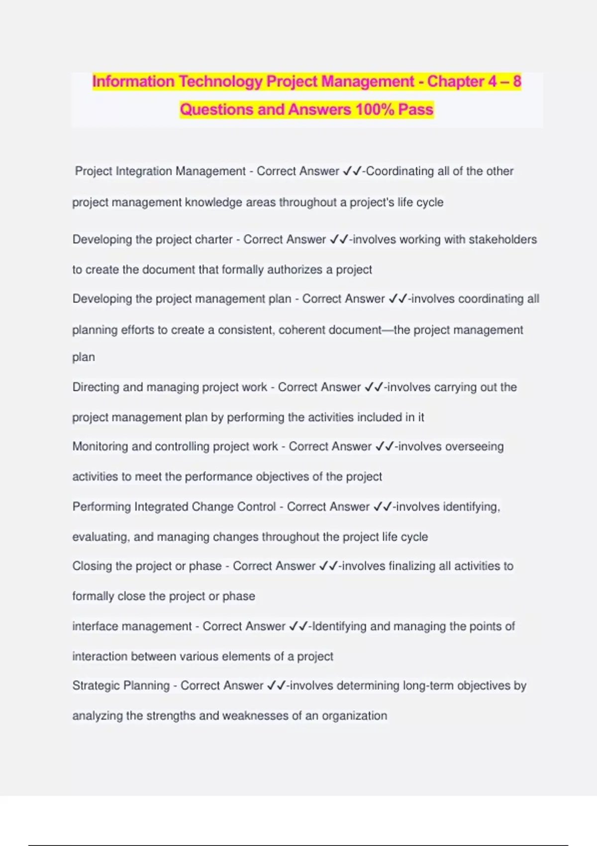 Information Technology Project Management - Chapter 4 – 8 Questions and Answers 100% Pass Project Integration Management - Correct Answer ️️ -Coordinating all of the other project management knowledge areas throughout a project's life cycle Developing the project charter - Correct Answer ️️ -involves working with stakeholders to create the document that formally authorizes a project Developing the project management plan - Correct Answer ️️ -involves coordinating all planning efforts to create a consistent, coherent document—the project management plan Directing and managing project work - Correct Answer ️️ -involves carrying out the project management plan by performing the activities included in it Monitoring and controlling project work - Correct Answer ️️ -involves overseeing activities to meet the performance objectives of the project Performing Integrated Change Control - Correct Answer ️️ -involves identifying, evaluating, and managing changes throughout the project life cycle Closing the project or phase - Correct Answer ️️ -involves finalizing all activities to formally close the project or phase interface management - Correct Answer ️️ -Identifying and managing the points of interaction between various elements of a project Strategic Planning - Correct Answer ️️ -involves determining long-term objectives by analyzing the strengths and weaknesses of an organization SWOT analysis - Correct Answer ️️ -Analyzing Strengths, Weaknesses, Opportunities, and Threats; used to aid in strategic planning Mind mapping - Correct Answer ️️ -a technique that uses branches radiating out from a core idea to structure thoughts and ideas Problems - Correct Answer ️️ -Undesirable situations that p