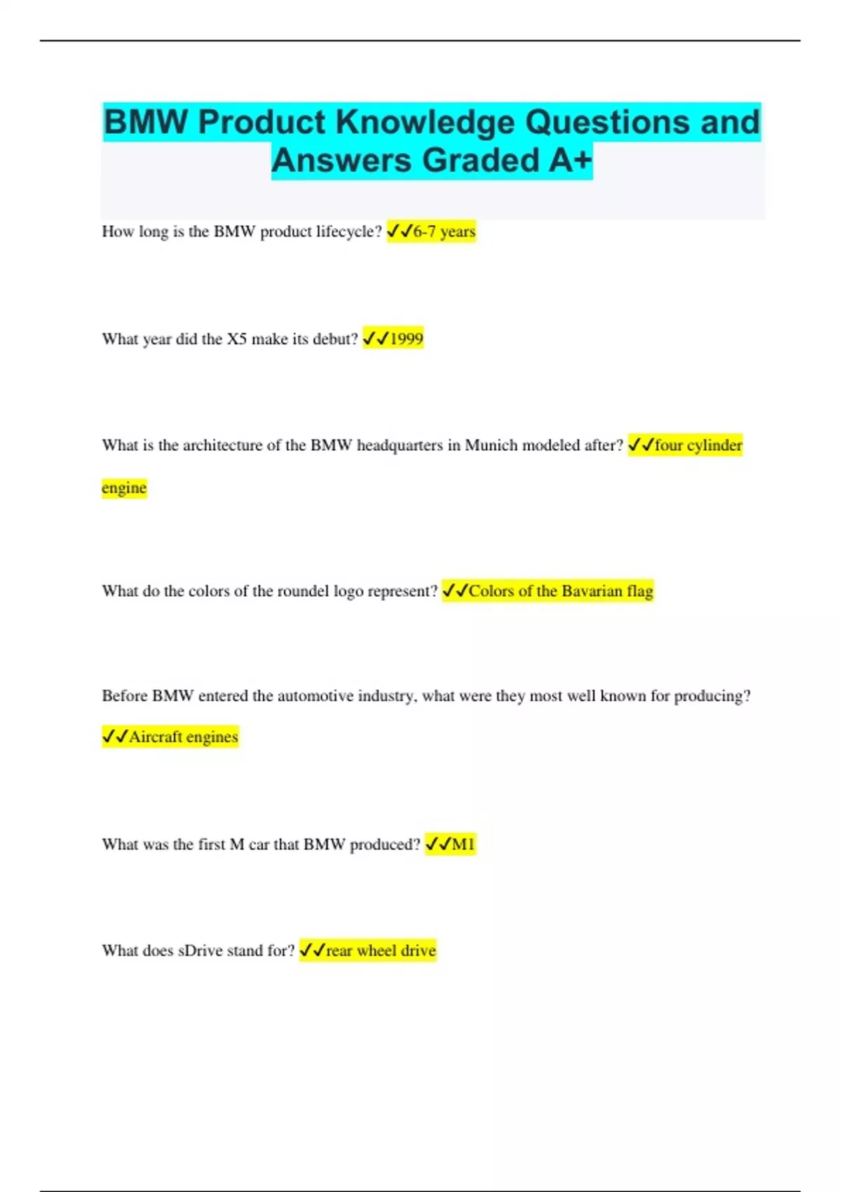 BMW Product Knowledge Questions and Answers Graded A+ How long is the BMW product lifecycle? 6-7 years What year did the X5 make its debut? 1999 What is the architecture of the BMW headquarters in Munich modeled after? four cylinder engine What do the colors of the roundel logo represent? Colors of the Bavarian flag Before BMW entered the automotive industry, what were they most well known for producing? Aircraft engines What was the first M car that BMW produced? M1 What does sDrive stand for? rear wheel drive What do the numbers in the BMW name stand for? (3 part answer) series, engine size, tuning How long does it take to open and close the top of a 4 Series and what is the highest speed this can be done at? (seconds & mph) 20 seconds, 11 mph What lines are available on the 3 series sedan? (excluding 320 models/4 part answer) Standard, Luxury, Sport, M Sport True OR False: Adaptive Full LED headlights are standard on all 6 series models? True What lines are available on the X3 SAV? (3 part answer) Standard, xLine, M Sport What is the power output on an X6 xDrive35i? (hp/lbs-ft) 300 hp/300 lbs-ft True OR Flase: The Z4 roiadster can be equipped with an all wheel drivetrain? False Up to what % of fuel savings is achieved by using ECO PRO mode? 20% True OR False: "TwinPower Turbo" indicates that the vehicle's engine is equipped with twin turbos False What year did the first ever BMW 4 cylinder engine debut? 1927 What does GT stand for? gran tourismo What current vehicles are produced at BMW Manufacturing
