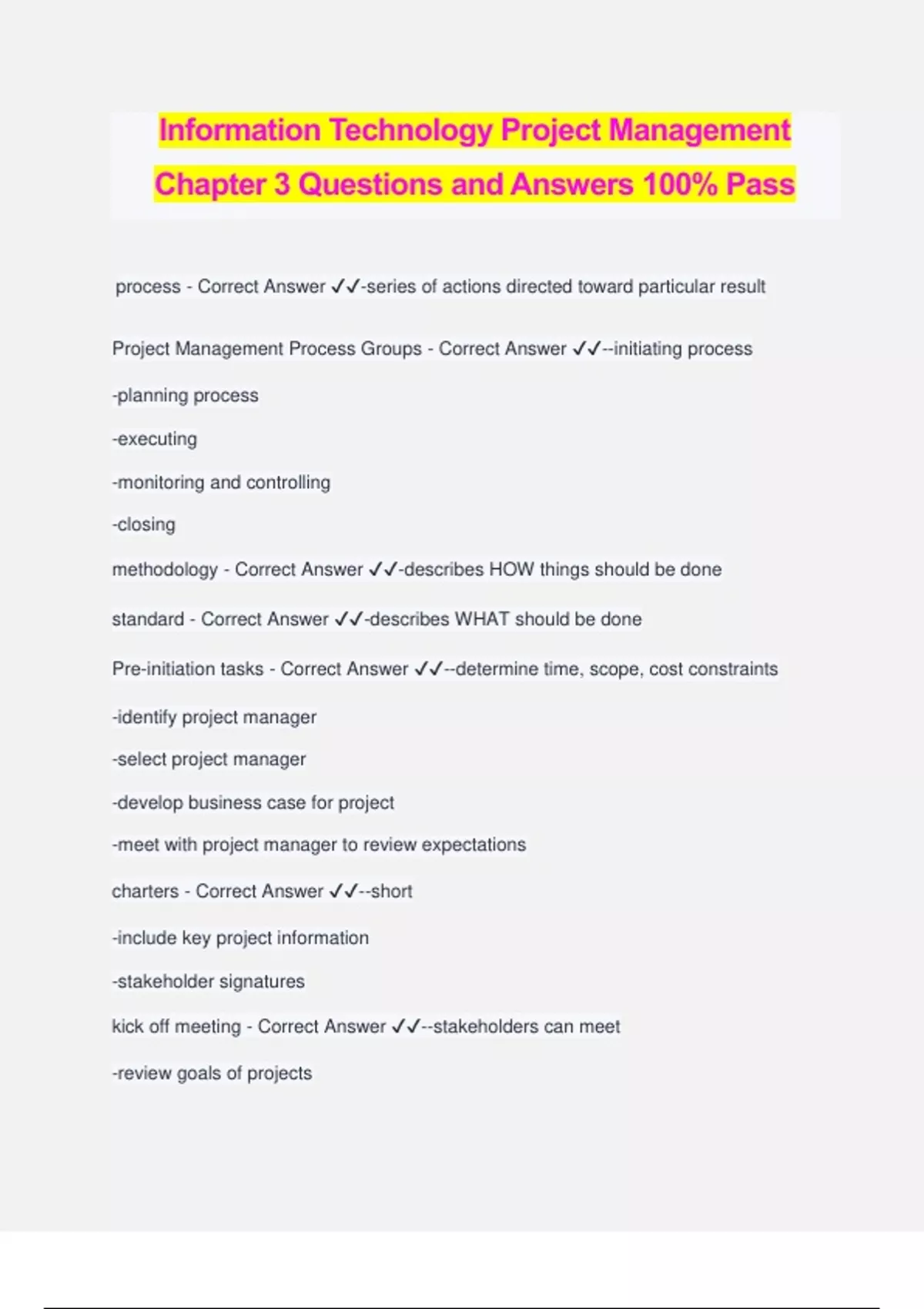 Information Technology Project Management Chapter 3 Questions and Answers 100% Pass process - Correct Answer ️️ -series of actions directed toward particular result Project Management Process Groups - Correct Answer ️️ --initiating process -planning process -executing -monitoring and controlling -closing methodology - Correct Answer ️️ -describes HOW things should be done standard - Correct Answer ️️ -describes WHAT should be done Pre-initiation tasks - Correct Answer ️️ --determine time, scope, cost constraints -identify project manager -select project manager -develop business case for project -meet with project manager to review expectations charters - Correct Answer ️️ --short -include key project information -stakeholder signatures kick off meeting - Correct Answer ️️ --stakeholders can meet -review goals of projects -discuss future plans Purpose of project planning - Correct Answer ️️ -guide execution Outputs in project - Correct Answer ️️ --team contract -project scope statement -work breakdown structure (WBS) -project schedule gantt chart -prioritized risks Prioritized Risks - Correct Answer ️️ --lack of inputs from consultants -lack of input from representatives -security of new system -promoting new system Project monitoring and controlling - Correct Answer ️️ --measuring progress toward project objectives, monitoring deviation from plan, taking correction actions -occurs during all phases of life cycle -outputs: performance reports Project Closing - Correct Answer ️️ --gain stakeholder