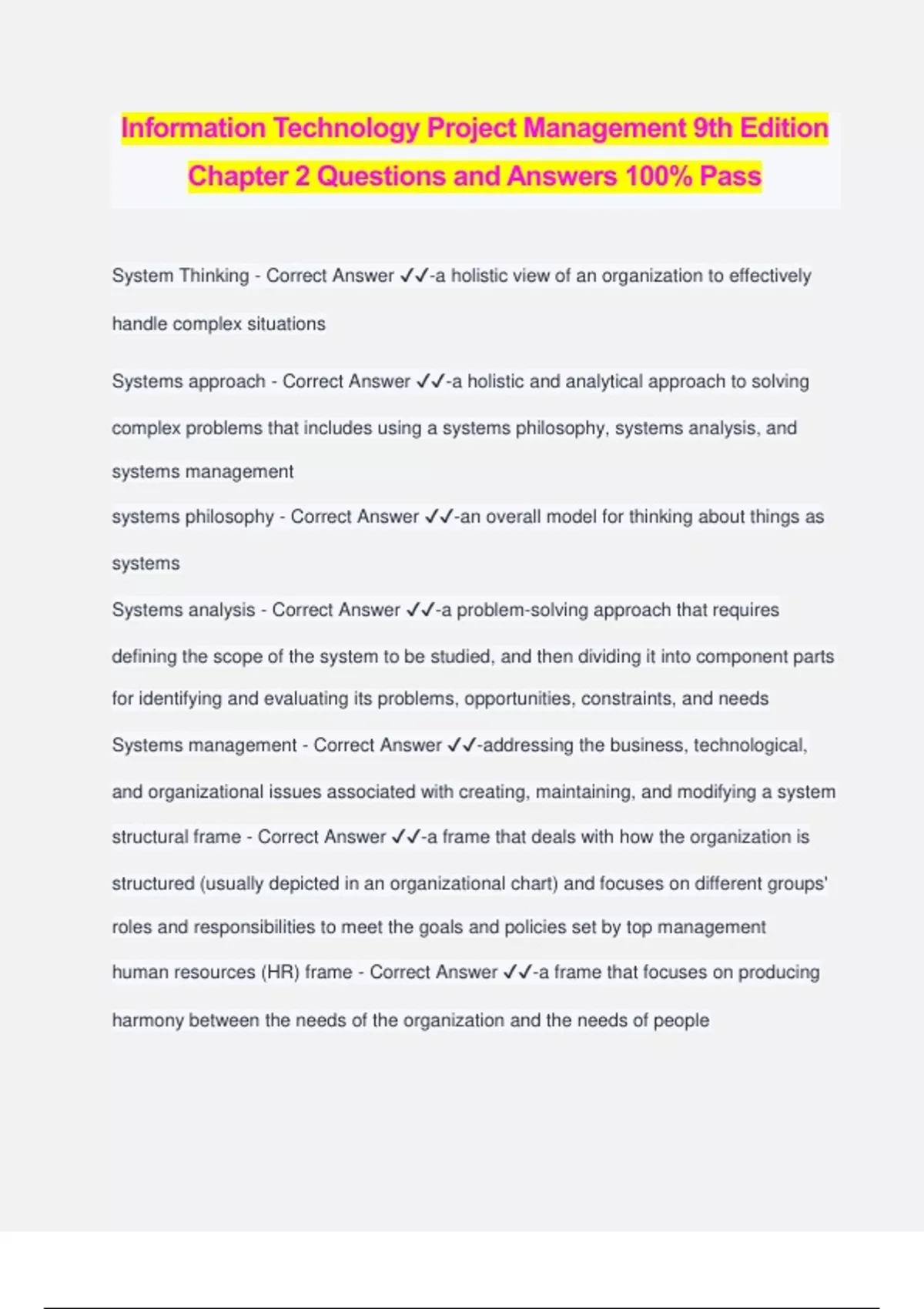Information Technology Project Management 9th Edition Chapter 2 Questions and Answers 100% Pass System Thinking - Correct Answer ️️ -a holistic view of an organization to effectively handle complex situations Systems approach - Correct Answer ️️ -a holistic and analytical approach to solving complex problems that includes using a systems philosophy, systems analysis, and systems management systems philosophy - Correct Answer ️️ -an overall model for thinking about things as systems Systems analysis - Correct Answer ️️ -a problem-solving approach that requires defining the scope of the system to be studied, and then dividing it into component parts for identifying and evaluating its problems, opportunities, constraints, and needs Systems management - Correct Answer ️️ -addressing the business, technological, and organizational issues associated with creating, maintaining, and modifying a system structural frame - Correct Answer ️️ -a frame that deals with how the organization is structured (usually depicted in an organizational chart) and focuses on different groups' roles and responsibilities to meet the goals and policies set by top management human resources (HR) frame - Correct Answer ️️ -a frame that focuses on producing harmony between the needs of the organization and the needs of people