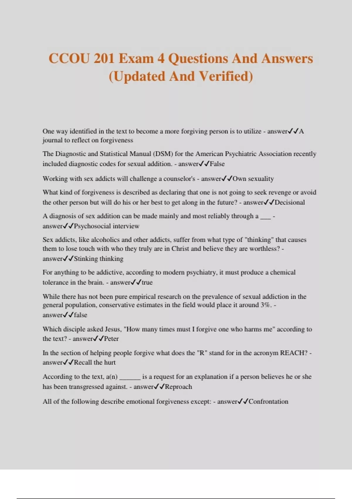 CCOU 201 Exam 4 Questions And Answers (Updated And Verified) One way identified in the text to become a more forgiving person is to utilize - answerA journal to reflect on forgiveness The Diagnostic and Statistical Manual (DSM) for the American Psychiatric Association recently included diagnostic codes for sexual addition. - answerFalse Working with sex addicts will challenge a counselor's - answerOwn sexuality What kind of forgiveness is described as declaring that one is not going to seek revenge or avoid the other person but will do his or her best to get along in the future? - answerDecisional A diagnosis of sex addition can be made mainly and most reliably through a ___ - answerPsychosocial interview Sex addicts, like alcoholics and other addicts, suffer from what type of "thinking" that causes them to lose touch with who they truly are in Christ and believe they are worthless? - answerStinking thinking For anything to be addictive, according to modern psychiatry, it must produce a chemical tolerance in the brain. - answertrue While there has not been pure empirical research on the prevalence of sexual addiction in the general population, conservative estimates in the field would place it around 3%. - answerfalse Which disciple asked Jesus, "How many times must I forgive one who harms me" according to the text? - answerPeter In the section of helping people forgive what does the "R" stand for in the acronym REACH? - answerRecall the hurt According to the text, a(n) ______ is a request for an explanation if a person believes he or she has been transgressed against. - answerReproach All of the following describe emotional forgiveness except: - answerConfrontation