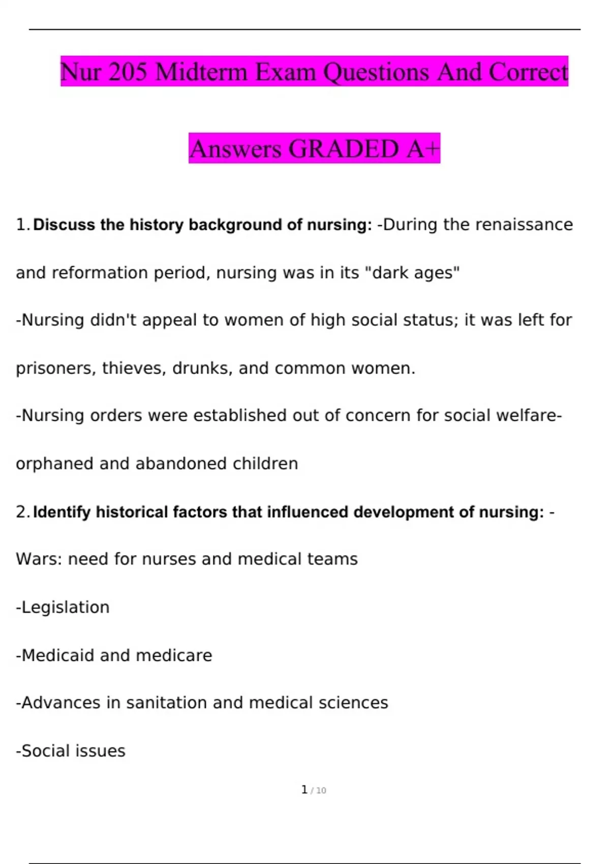 NUR 205 Midterm Exam Test Questions With Answers Graded A+ 2023