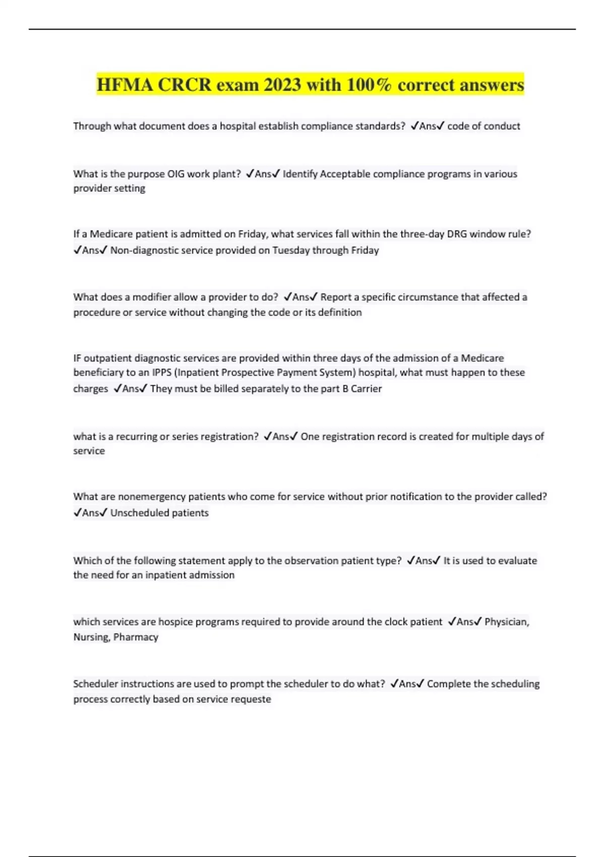 HFMA CRCR exam 2023 with 100% correct answers Through what document does a hospital establish compliance standards? Ans code of conduct What is the purpose OIG work plant? Ans Identify Acceptable compliance programs in various provider setting If a Medicare patient is admitted on Friday, what services fall within the three-day DRG window rule? Ans Non-diagnostic service provided on Tuesday through Friday What does a modifier allow a provider to do? Ans Report a specific circumstance that affected a procedure or service without changing the code or its definition IF outpatient diagnostic services are provided within three days of the admission of a Medicare beneficiary to an IPPS (Inpatient Prospective Payment System) hospital, what must happen to these charges Ans They must be billed separately to the part B Carrier what is a recurring or series registration? Ans One registration record is created for multiple days of service What are nonemergency patients who come for service without prior notification to the provider called? Ans Unscheduled patients Which of the following statement apply to the observation patient type? Ans It is used to evaluate the need for an inpatient admission which services are hospice programs required to provide around the clock patient Ans Physician, Nursing, Pharmacy Scheduler instructions are used to prompt the scheduler to do what? Ans Complete the scheduling process correctly based on service requeste The Time needed to prepare the patient before service is the difference between the patients arrival time and which of the following? Ans Procedure time Medicare guidelines require that when a test is ordered for a LCD or NCD exists, the information provided on the order must include: Ans Documentation of the medical necessity for the test What is the advantage of a pre-registration program Ans It reduces processing times at the time of service What date are required to establish a new MPI(Master patient Index) entry Ans The responsible party's full legal name, date of birth, and social security number Which of the following statements is true about third-party payments? Ans The payments are received by the provider from the payer responsible for reimbursing the provider for the patient's covered services. Which provision protects the patient from medical expenses that exceed the pre-set level Ans stop loss what documentation must a primary care physician send to HMO patient to authorize a visit to a specialist for additional testing or care? Ans Referral Under EMTALA (Emergency Medical Treatment and Labor Act) regulations, the provider may not ask about a patient's insurance information if it would delay what? Ans Medical screening and stabilizing treatment Which of the following is a step in the discharge process? Ans Have a case management service complete the discharge plan The hospital has a APC based contract for the payment of outpatient services. Total anticipated charges for the visit are $2,380. The approved APC payment rate is $780. Where will the patients benefit package be applied? Ans To the approved APC payment rate A patient has met the $200 individual deductible and $900 of the $1000 co-insurance responsibility. The co-insurance rate is 20%. The estimated insurance plan responsibility is $1975.00. What amount of coinsurance is due from the patient? Ans $100.00 When is a patient considered to be medically indigent? Ans The patient's outstanding medical bills exceed a defined dollar amount or percentage of assets. What patient assets are considered in the financial assistance application? Ans Sources of readily available funds , vehicles, campers, boats and saving accounts If the patient cannot agree to payment arrangements, What is the next option? Ans Warn the patient that unpaid accounts are placed with collection agencies for further processing What core financial activities are resolved within patient access? Ans scheduling , pre-registration, insurance verification and managed care processing What is an unscheduled direct admission? Ans A patient who arrives at the hospital via ambulance for treatment in the emergency department