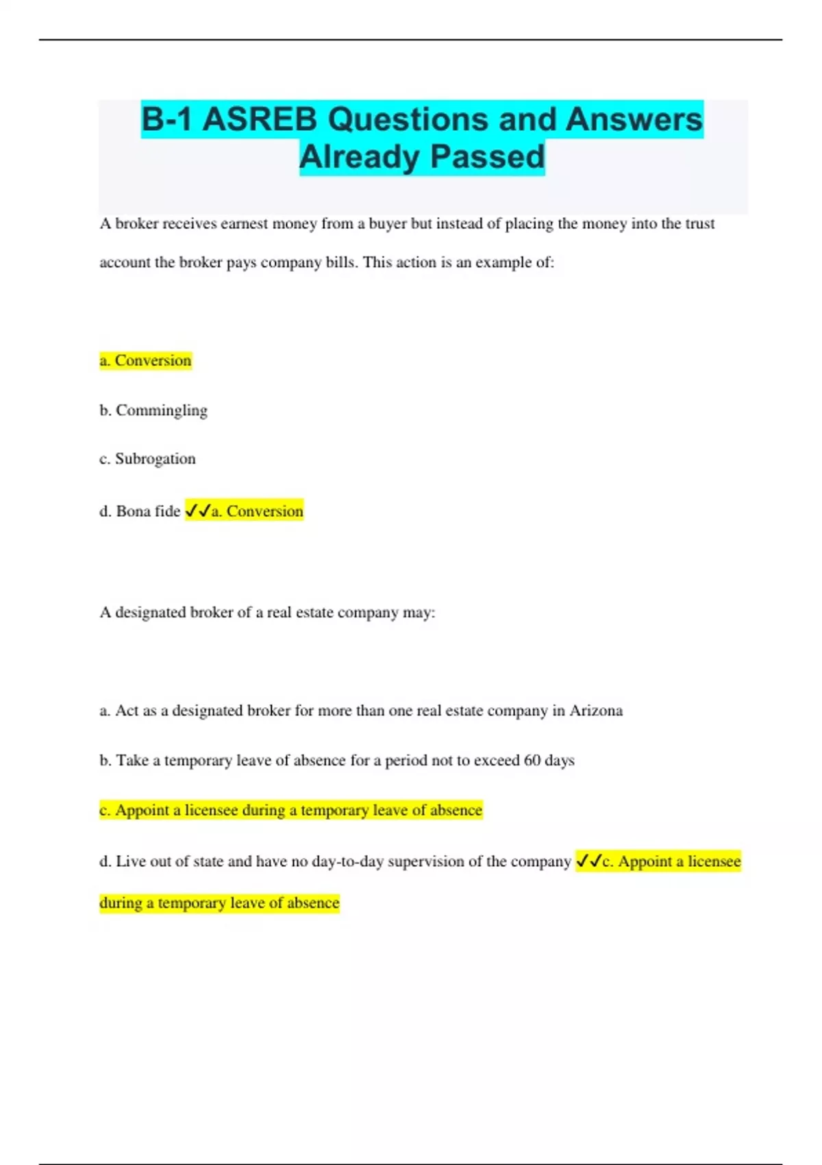 B-1 ASREB Questions and Answers Already Passed A broker receives earnest money from a buyer but instead of placing the money into the trust account the broker pays company bills. This action is an example of: a. Conversion b. Commingling c. Subrogation d. Bona fide a. Conversion A designated broker of a real estate company may: a. Act as a designated broker for more than one real estate company in Arizona b. Take a temporary leave of absence for a period not to exceed 60 days c. Appoint a licensee during a temporary leave of absence d. Live out of state and have no day-to-day supervision of the company c. Appoint a licensee during a temporary leave of absence A license is granted for: a. 1 year b. 2 years c. 3 years d. 4 years b. 2 years A sale of real property is being handled in the brokers office and there is no escrow called for in the contract. Broker prepares several documents in the sale at a cost of $35. Who can the broker charge for this cost? a. Seller b. Buyer c. 1/2 to seller and 1/2 to buyer d. no one A subdivider employés hostesses to show houses. The hostesses explain the features of the homes and gave the prices and terms. In this scenario: a. Only the sales broker needs to be licensed b. Hostesses are employees only and need not be licensed c. The hostesses must be licensed d. As long as they do not accept deposits and do not write up sales, the hostesses need not be licensed c. The hostesses must be licensed