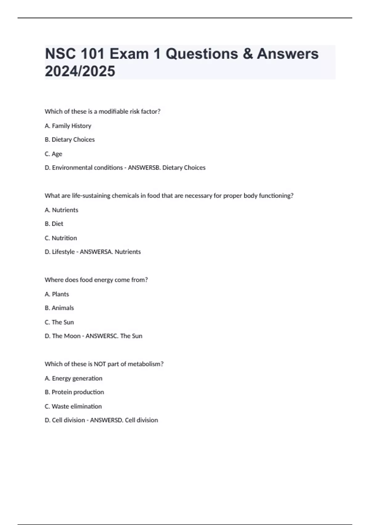 NSC 101 Exam 1 Questions & Answers 2024/2025 Which of these is a modifiable risk factor? A. Family History B. Dietary Choices C. Age D. Environmental conditions - ANSWERSB. Dietary Choices What are life-sustaining chemicals in food that are necessary for proper body functioning? A. Nutrients B. Diet C. Nutrition D. Lifestyle - ANSWERSA. Nutrients Where does food energy come from? A. Plants B. Animals C. The Sun D. The Moon - ANSWERSC. The Sun Which of these is NOT part of metabolism? A. Energy generation B. Protein production C. Waste elimination D. Cell division - ANSWERSD. Cell division