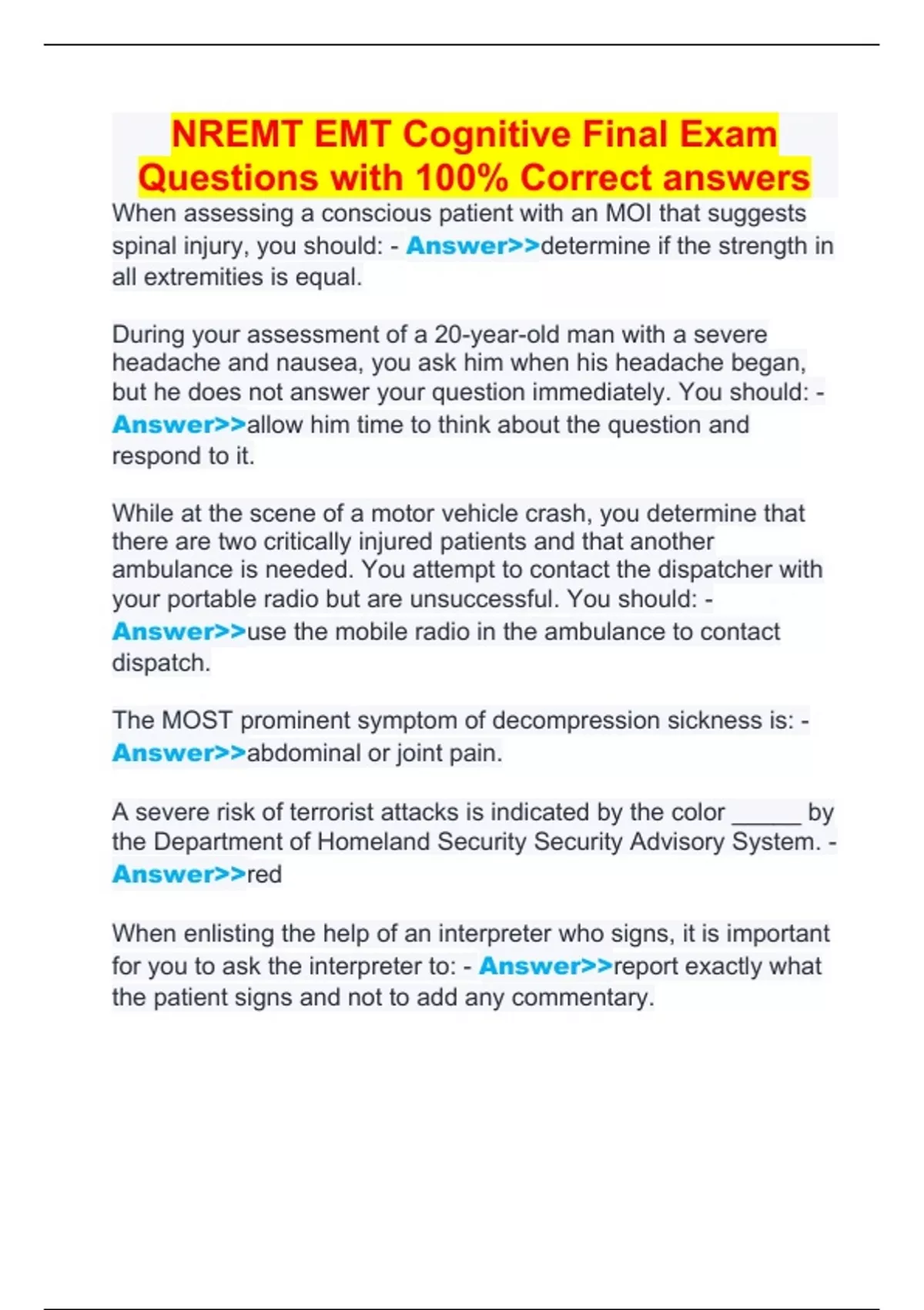 NREMT EMT Cognitive Final Exam Questions with 100% Correct answers
