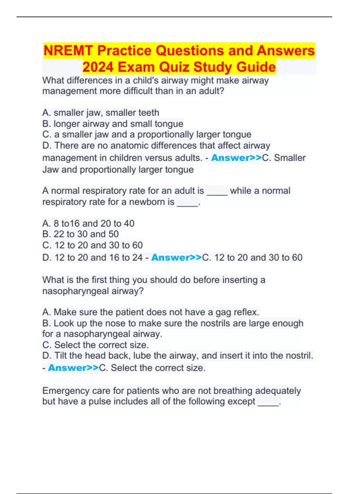 NREMT Practice Questions and Answers 2024 Exam Quiz Study Guide