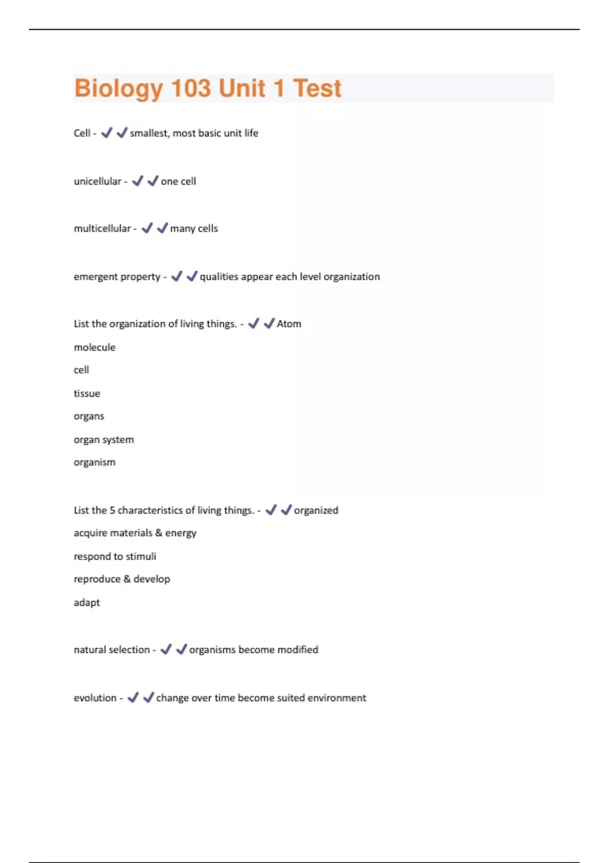 Biology 103 Unit 1 Test latest questions and answers all are correct graded A+