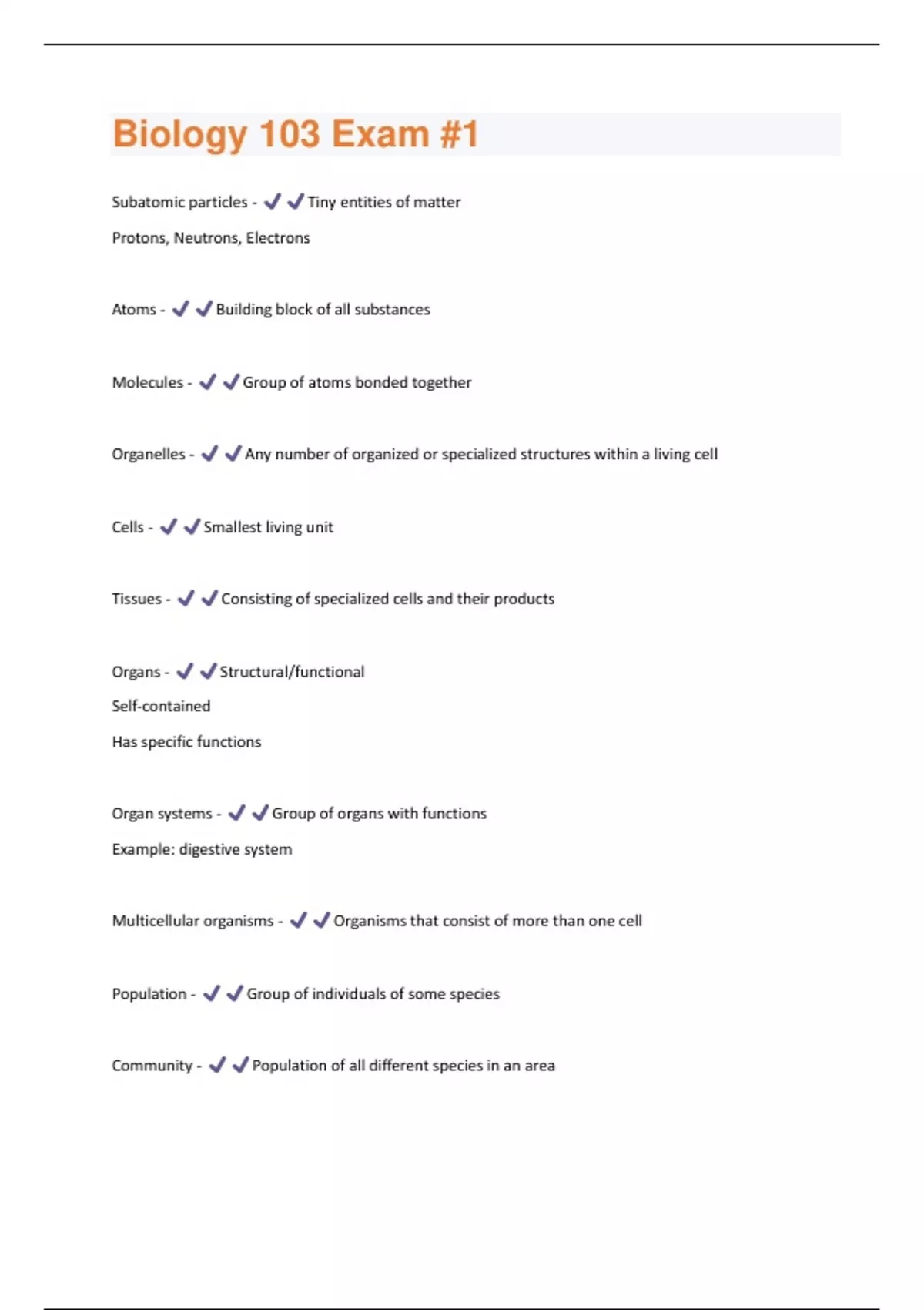 Subatomic particles - Tiny entities of matter Protons, Neutrons, Electrons Atoms - Building block of all substances Molecules - Group of atoms bonded together Organelles - Any number of organized or specialized structures within a living cell Cells - Smallest living unit Tissues - Consisting of specialized cells and their products Organs - Structural/functional Self-contained Has specific functions Organ systems - Group of organs with functions Example: digestive system Multicellular organisms - Organisms that consist of more than one cell Population - Group of individuals of some species Community - Population of all different species in an areaEcosystem - Living communities and non-living physical environment Biotic: living Abiotic: non-living Biosphere - All ecosystems together on earth Know diagram of plant cells - The atom in a single molecules of water form ________ bonds? - Covalent Bonds that form between multiple (different) water molecules because each water molecule has a slightly negative and slightly positive region are called _____ bonds - Hydrogen Which organelle contains strong digestive enzymes (proteins) to break down other structures? - Lysosomes Which of the following is the most complex "Level of Organization" - Organ system Which of the following in the least complex "Level of Organization" - Organelle What are building blocks of proteins? - Amino acids How many amino acids are there? - 20 What is the difference between the "Essential Ones" amino acids? - Ones we have to eat that our body doesn't have What were the 3 types of nucleic acids? - DNARNA ATP Name the broad groups of organic molecules - Carbohydrates Lipids Proteins Nucleic Acids Describe diffusion - 1. Concentration gradient 2. Membrane permeability 3. Surface are How do solutes/particles move - High to low