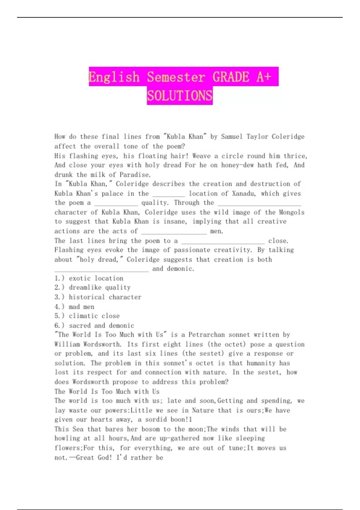 "The World Is Too Much with Us" is a Petrarchan sonnet written by
