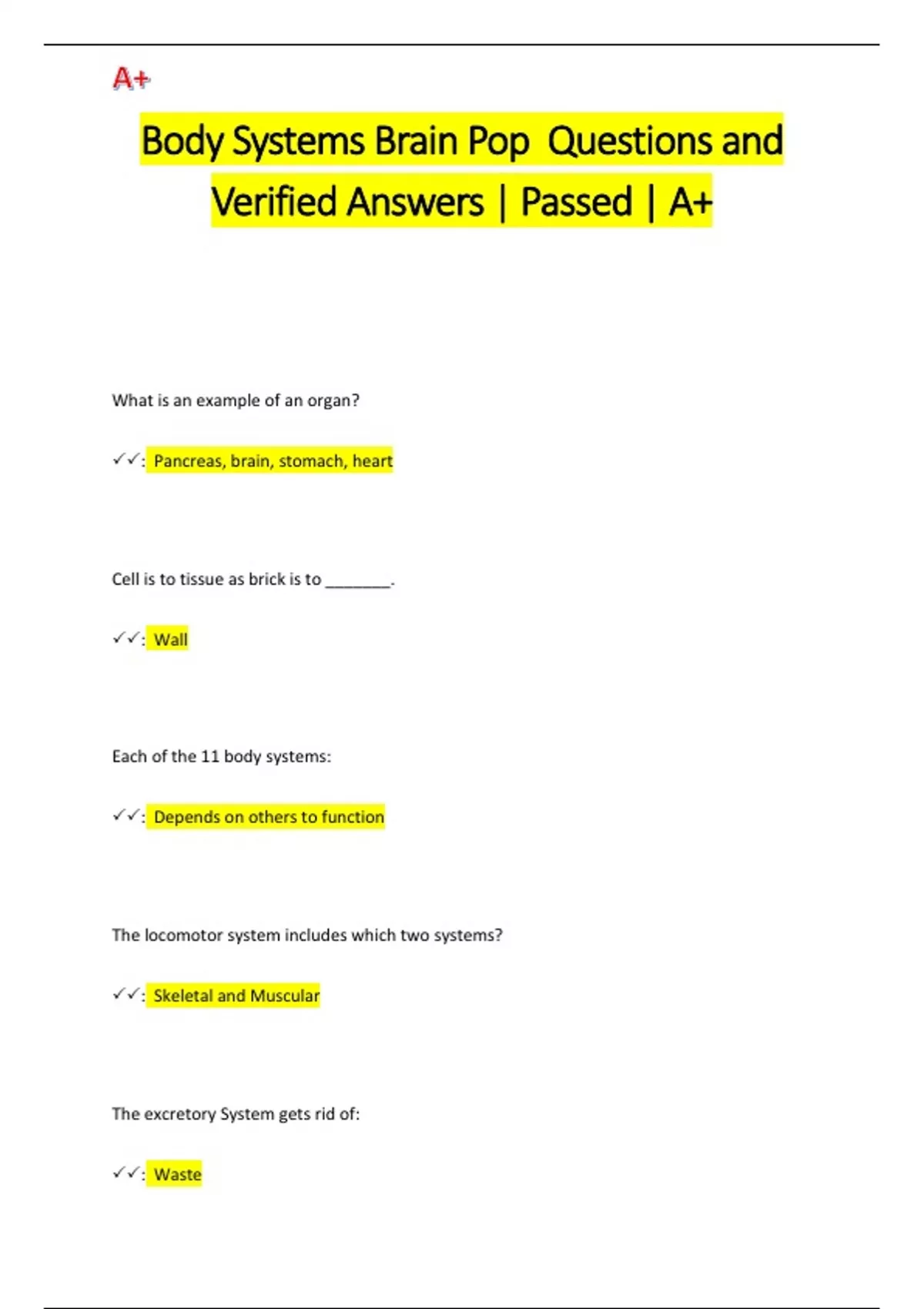 Body Systems Brain Pop Questions and Verified Answers | Passed | A+