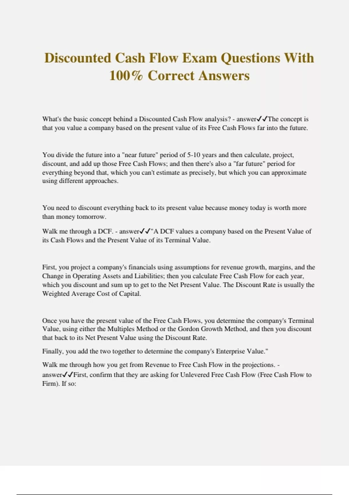 Discounted Cash Flow Exam Questions With 100% Correct Answers What's the basic concept behind a Discounted Cash Flow analysis? - answerThe concept is that you value a company based on the present value of its Free Cash Flows far into the future. You divide the future into a "near future" period of 5-10 years and then calculate, project, discount, and add up those Free Cash Flows; and then there's also a "far future" period for everything beyond that, which you can't estimate as precisely, but which you can approximate using different approaches. You need to discount everything back to its present value because money today is worth more than money tomorrow. Walk me through a DCF. - answer"A DCF values a company based on the Present Value of its Cash Flows and the Present Value of its Terminal Value. First, you project a company's financials using assumptions for revenue growth, margins, and the Change in Operating Assets and Liabilities; then you calculate Free Cash Flow for each year, which you discount and sum up to get to the Net Present Value. The Discount Rate is usually the Weighted Average Cost of Capital. Once you have the present value of the Free Cash Flows, you determine the company's Terminal Value, using either the Multiples Method or the Gordon Growth Method, and then you discount that back to its Net Present Value using the Discount Rate. Finally, you add the two together to determine the company's Enterprise Value." Walk me through how you get from Revenue to Free Cash Flow in the projections. - answerFirst, confirm that they are asking for Unlevered Free Cash Flow (Free Cash Flow to Firm). If so: Subtract COGS and Operating Expenses from Revenue to get to Operating Income (EBIT) - or just use the EBIT margin you've assumed. Then, multiply by (1 - Tax Rate), add back Depreciation, Amortization, and other non-cash charges, and factor in the Change in Operating Assets and Liabilities. If Assets increase by more than Liabilities, this is a negative; otherwise it's positive. Finally, subtract Capital Expenditures to calculate Unlevered Free Cash Flow. Levered Free Cash Flow (FCFE) is similar, but you must also subtract the Net Interest Expense before multiplying by (1 - Tax Rate), and you must also subtract Mandatory Debt Repayments at the end. What's the point of Free Cash Flow, anyway? What are you trying to do? - answerThe idea is that you're replicating the Cash Flow Statement, but only including recurring, predictable items. And in the case of Unlevered Free Cash Flow, you also exclude the impact of Debt entirely. That's why everything in Cash Flow from Investing except for CapEx is excluded, and why the entire Cash Flow from Financing section is excluded (the only exception being Mandatory Debt Repayments for Levered FCF). Why do you use 5 or 10 years for the "near future" DCF projections? - answerThat's about as far as you can reasonably predict for most companies. Less than 5 years would be too short to be useful, and more than 10 years is too difficult to project for most companies. Is there a valid reason why we might sometimes project 10 years or more anyway? - answerYou might sometimes do this if it's a cyclical industry, such as chemicals, because it may be important to show the entire cycle from low to high. What do you usually use for the Discount Rate? - answerIn a Unlevered DCF analysis, you use WACC (Weighted Average Cost of Capital), which reflects the "Cost" of Equity, Debt, and Preferred Stock. In a Levered DCF analysis, you use Cost of Equity instead. If I'm working with a public company in a DCF, how do I move from Enterprise Value to its Implied per Share Value? - answerOnce you get to Enterprise Value, ADD Cash and then SUBTRACT Debt, Preferred Stock, and Noncontrolling Interests (and any other debt-like items) to get to Equity Value. Then you divide by the company's share count (factoring in all dilutive securities) to determine the implied per-share price. Let's say we do this and find that the Implied per Share Value is $10.00. The company's current share price is $5.00. What does this mean? - answerBy itself, this does not mean much - you