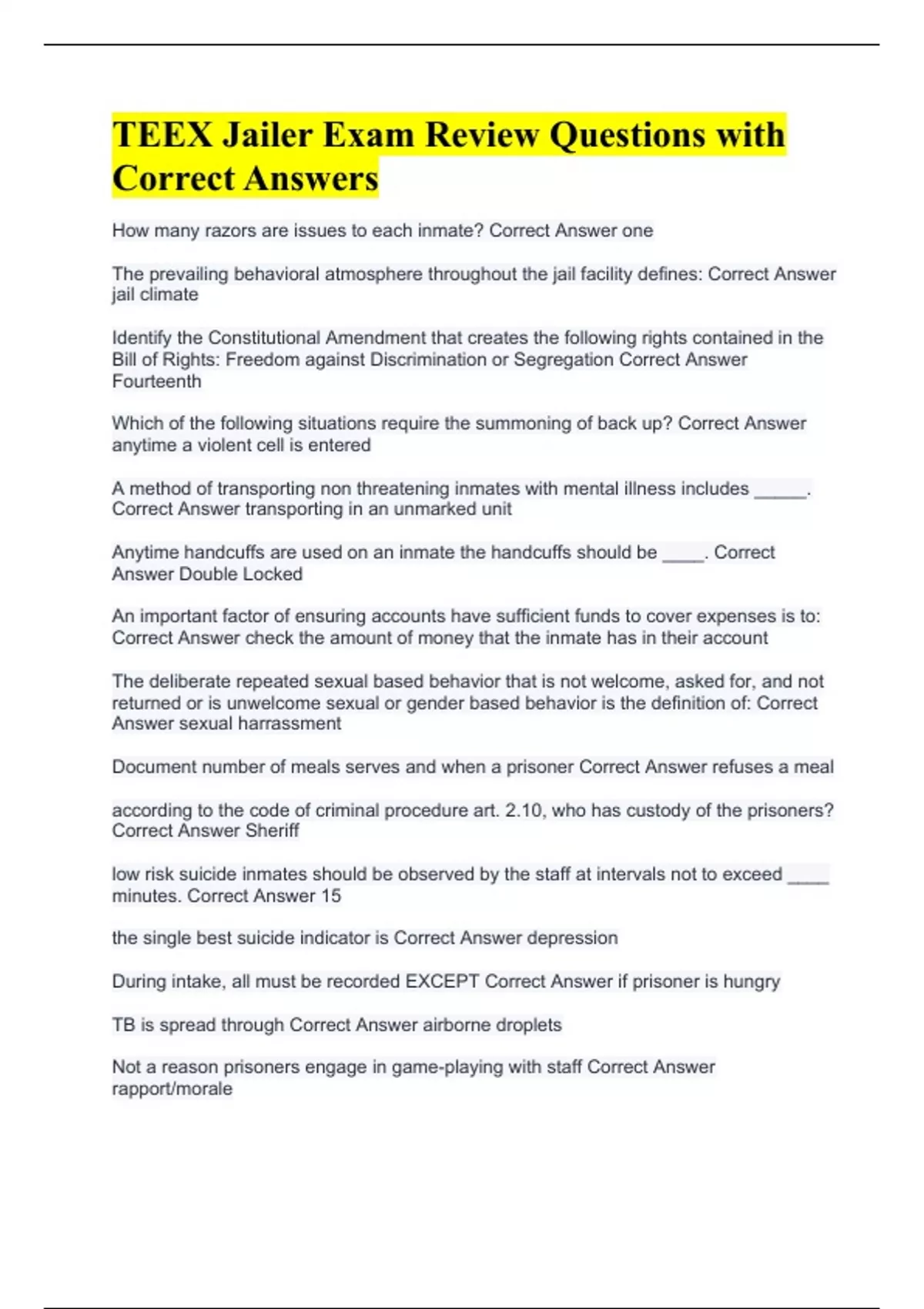How many razors are issues to each inmate? Correct Answer one The prevailing behavioral atmosphere throughout the jail facility defines: Correct Answer jail climate Identify the Constitutional Amendment that creates the following rights contained in the Bill of Rights: Freedom against Discrimination or Segregation Correct Answer Fourteenth Which of the following situations require the summoning of back up? Correct Answer anytime a violent cell is entered A method of transporting non threatening inmates with mental illness includes _____. Correct Answer transporting in an unmarked unit Anytime handcuffs are used on an inmate the handcuffs should be ____. Correct Answer Double Locked An important factor of ensuring accounts have sufficient funds to cover expenses is to: Correct Answer check the amount of money that the inmate has in their account The deliberate repeated sexual based behavior that is not welcome, asked for, and not returned or is unwelcome sexual or gender based behavior is the definition of: Correct Answer sexual harrassment Document number of meals serves and when a prisoner Correct Answer refuses a meal according to the code of criminal procedure art. 2.10, who has custody of the prisoners? Correct Answer Sheriff low risk suicide inmates should be observed by the staff at intervals not to exceed ____ minutes. Correct Answer 15 the single best suicide indicator is Correct Answer depression