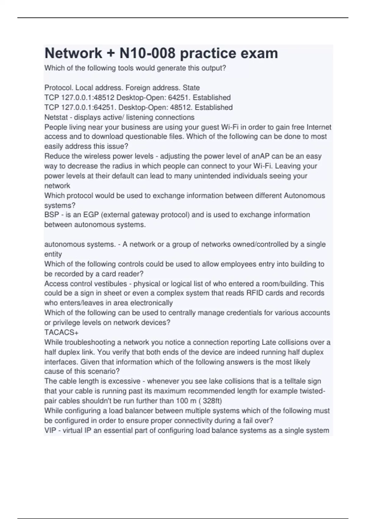Network + N10-008 practice exam Which of the following tools would generate this output? Protocol. Local address. Foreign address. State TCP 127.0.0.1:48512 Desktop-Open: 64251. Established TCP 127.0.0.1:64251. Desktop-Open: 48512. Established Netstat - displays active/ listening connections People living near your business are using your guest Wi-Fi in order to gain free Internet access and to download questionable files. Which of the following can be done to most easily address this issue? Reduce the wireless power levels - adjusting the power level of anAP can be an easy way to decrease the radius in which people can connect to your Wi-Fi. Leaving your power levels at their default can lead to many unintended individuals seeing your network Which protocol would be used to exchange information between different Autonomous systems? BSP - is an EGP (external gateway protocol) and is used to exchange information between autonomous systems. autonomous systems. - A network or a group of networks owned/controlled by a single entity Which of the following controls could be used to allow employees entry into building to be recorded by a card reader? Access control vestibules - physical or logical list of who entered a room/building. This could be a sign in sheet or even a complex system that reads RFID cards and records who enters/leaves in area electronically Which of the following can be used to centrally manage credentials for various accounts or privilege levels on network devices? TACACS+