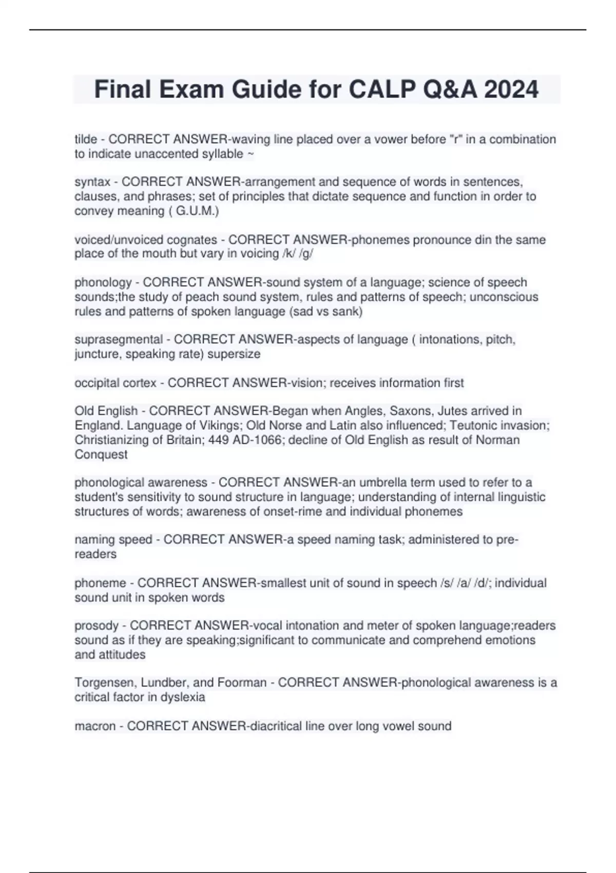 Final Exam Guide for CALP Q&A 2024 tilde - CORRECT ANSWER-waving line placed over a vower before "r" in a combination to indicate unaccented syllable ~ syntax - CORRECT ANSWER-arrangement and sequence of words in sentences, clauses, and phrases; set of principles that dictate sequence and function in order to convey meaning ( G.U.M.) voiced/unvoiced cognates - CORRECT ANSWER-phonemes pronounce din the same place of the mouth but vary in voicing /k/ /g/ phonology - CORRECT ANSWER-sound system of a language; science of speech sounds;the study of peach sound system, rules and patterns of speech; unconscious rules and patterns of spoken language (sad vs sank) suprasegmental - CORRECT ANSWER-aspects of language ( intonations, pitch, juncture, speaking rate) supersize occipital cortex - CORRECT ANSWER-vision; receives information first Old English - CORRECT ANSWER-Began when Angles, Saxons, Jutes arrived in England. Language of Vikings; Old Norse and Latin also influenced; Teutonic invasion; Christianizing of Britain; 449 AD-1066; decline of Old English as result of Norman Conquest phonological awareness - CORRECT ANSWER-an umbrella term used to refer to a student's sensitivity to sound structure in language; understanding of internal linguistic structures of words; awareness of onset-rime and individual phonemes naming speed - CORRECT ANSWER-a speed naming task; administered to prereaders phoneme - CORRECT ANSWER-smallest unit of sound in speech /s/ /a/ /d/; individual sound unit in spoken words prosody - CORRECT ANSWER-voca