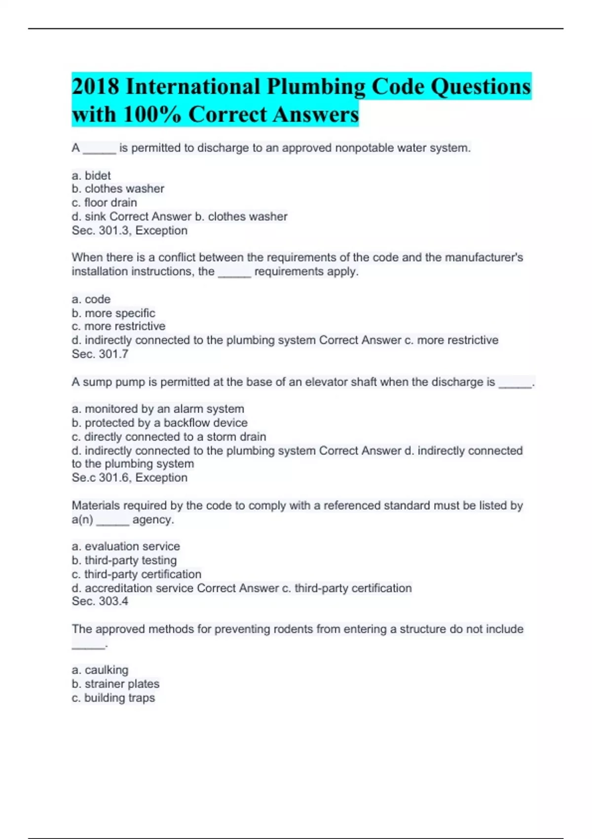 A _____ is permitted to discharge to an approved nonpotable water system. a. bidet b. clothes washer c. floor drain d. sink Correct Answer b. clothes washer Sec. 301.3, Exception When there is a conflict between the requirements of the code and the manufacturer's installation instructions, the _____ requirements apply. a. code b. more specific c. more restrictive d. indirectly connected to the plumbing system Correct Answer c. more restrictive Sec. 301.7 A sump pump is permitted at the base of an elevator shaft when the discharge is _____. a. monitored by an alarm system b. protected by a backflow device c. directly connected to a storm drain d. indirectly connected to the plumbing system Correct Answer d. indirectly connected to the plumbing system Se.c 301.6, Exception Materials required by the code to comply with a referenced standard must be listed by a(n) _____ agency. a. evaluation service b. third-party testing c. third-party certification d. accreditation service Correct Answer c. third-party certification Sec. 303.4 The approved methods for preventing rodents from entering a structure do not include _____. a. caulking b. strainer plates c. building traps