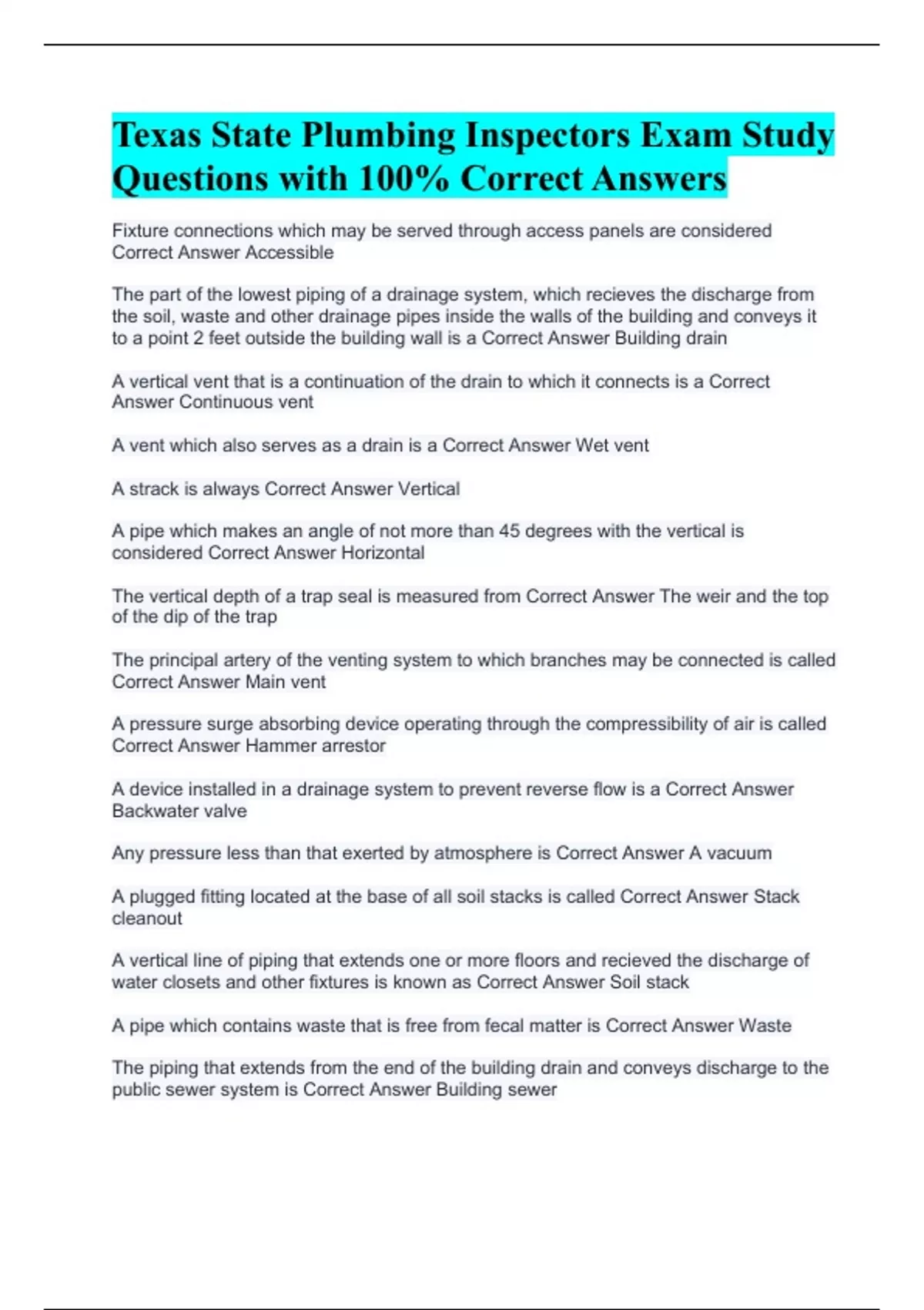 Texas State Plumbing Inspectors Exam Study Questions with 100% Correct Answers
