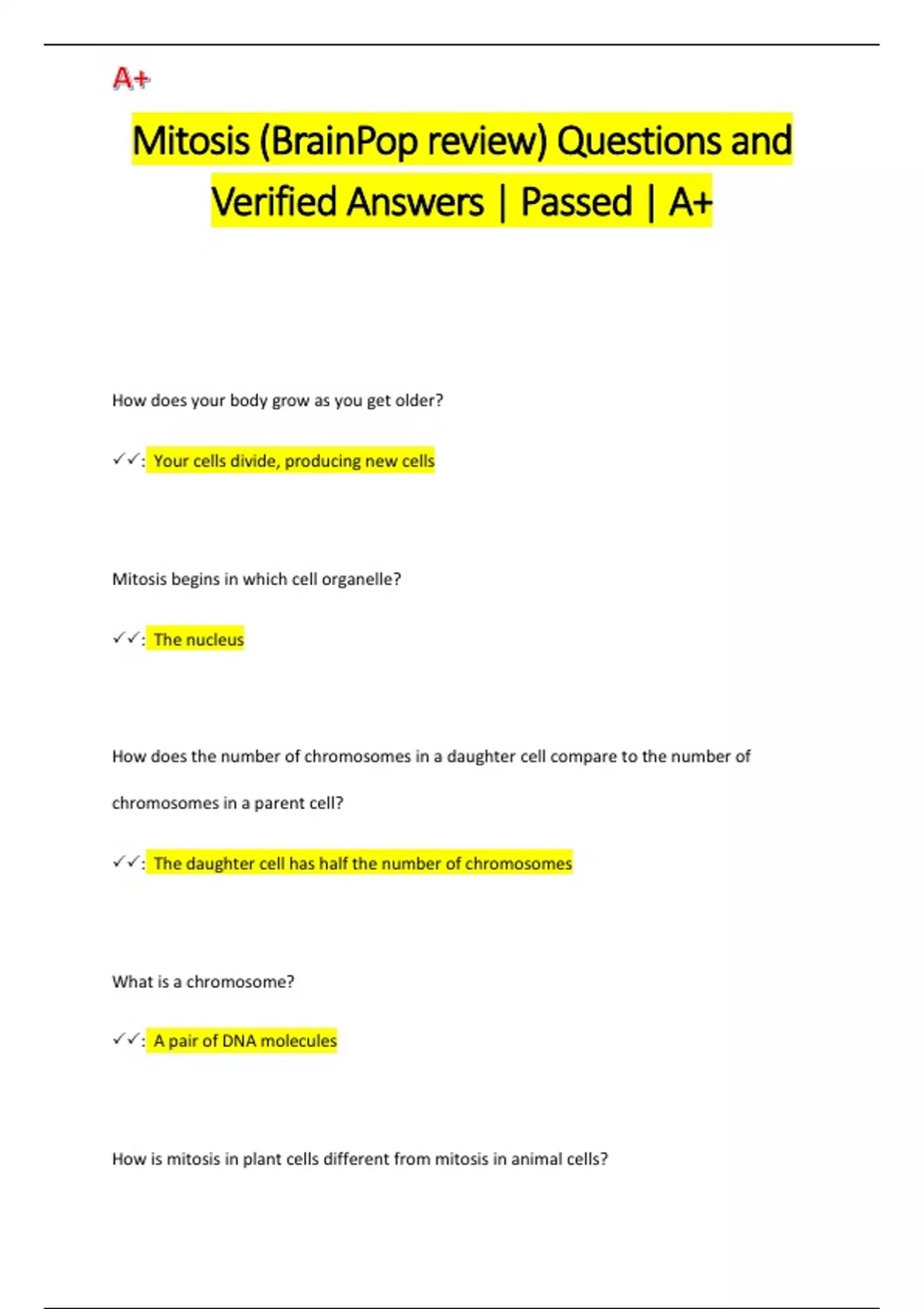 Mitosis (BrainPop review) Questions and Verified Answers | Passed | A+
