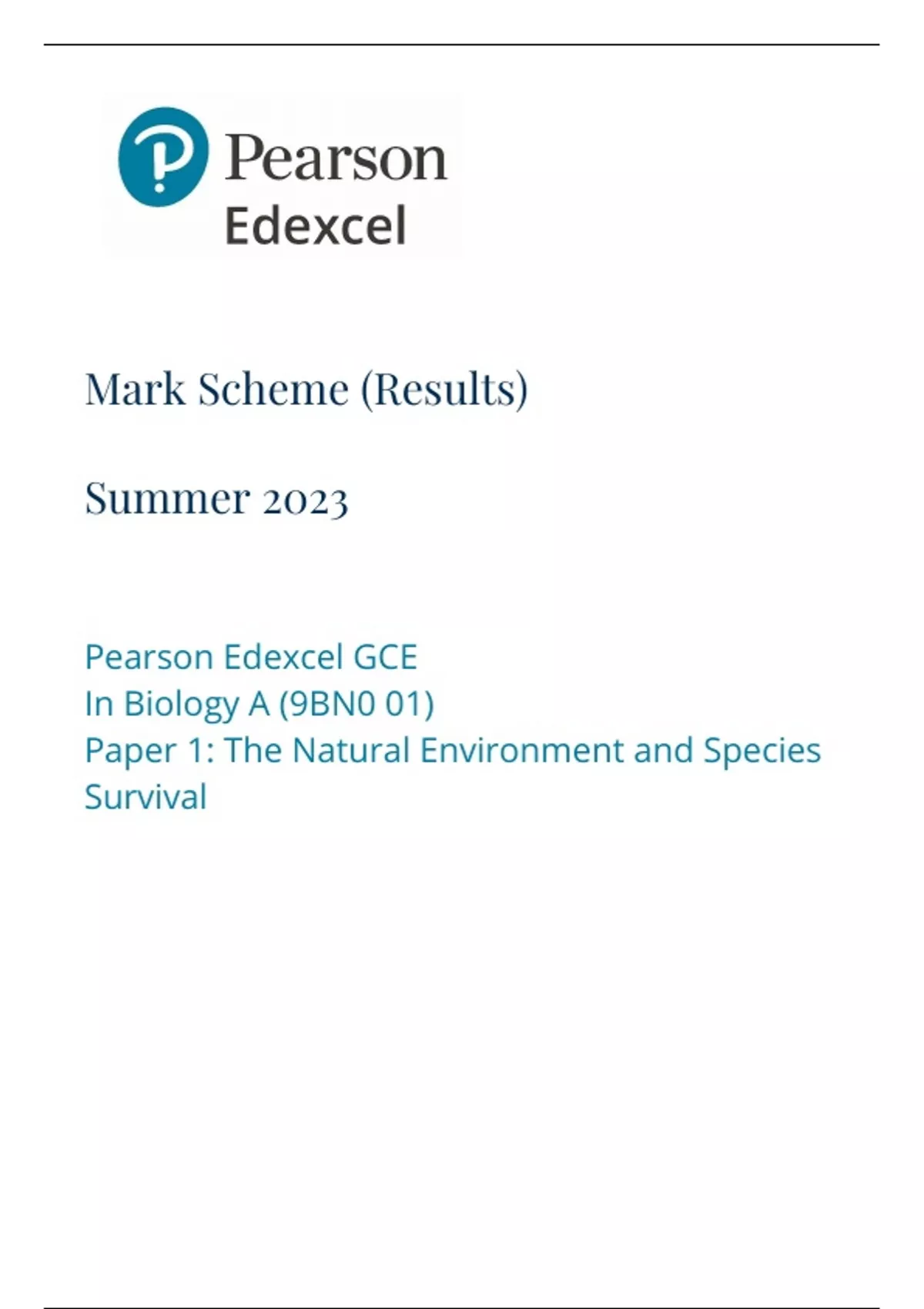 Pearson Edexcel GCE Biology A Advanced Salters Nuffield Paper 01 9BN01:The Natural Environment and Species Survival mark scheme for June 2023