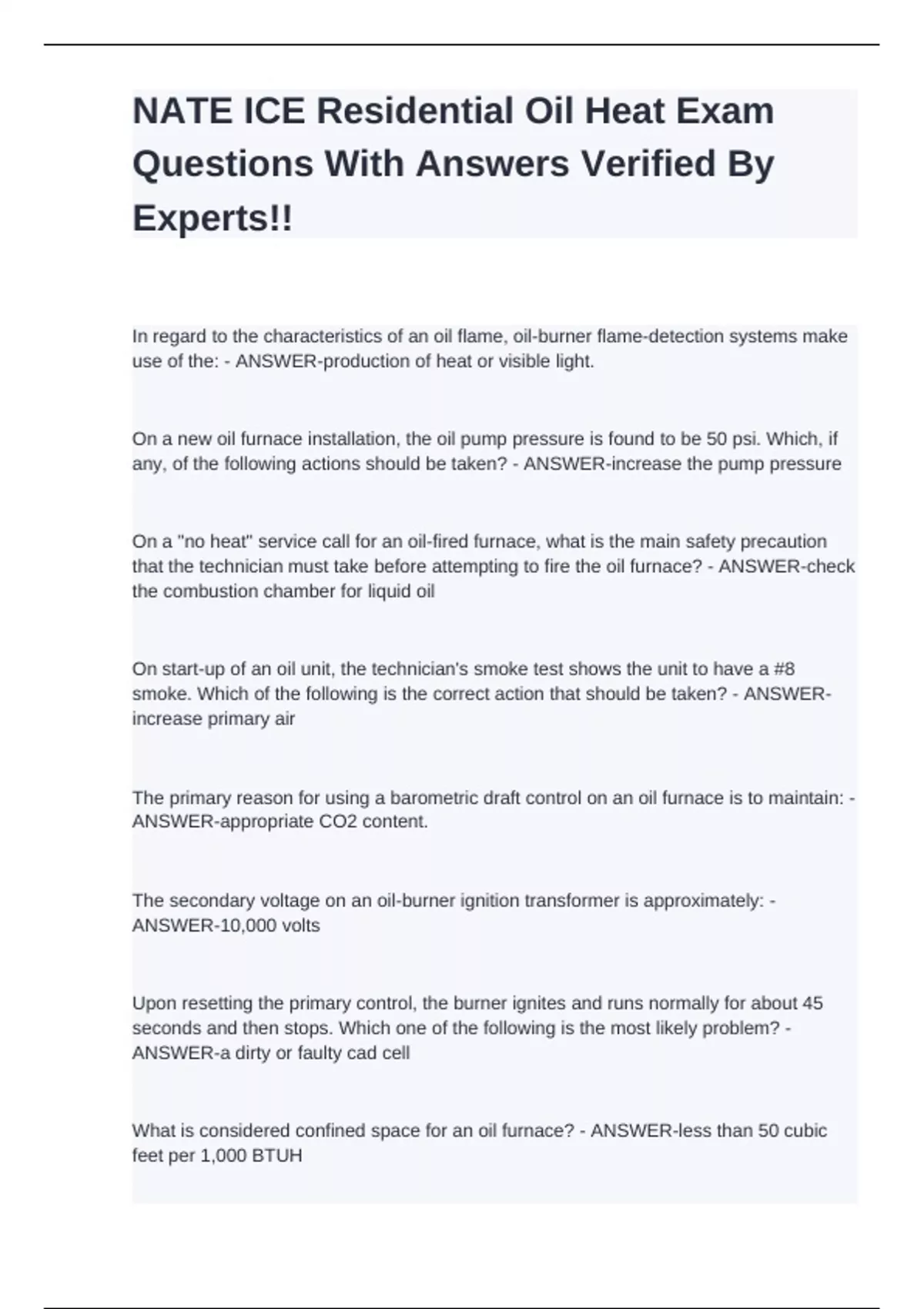 NATE ICE Residential Oil Heat Exam Questions With Answers Verified By Experts!!