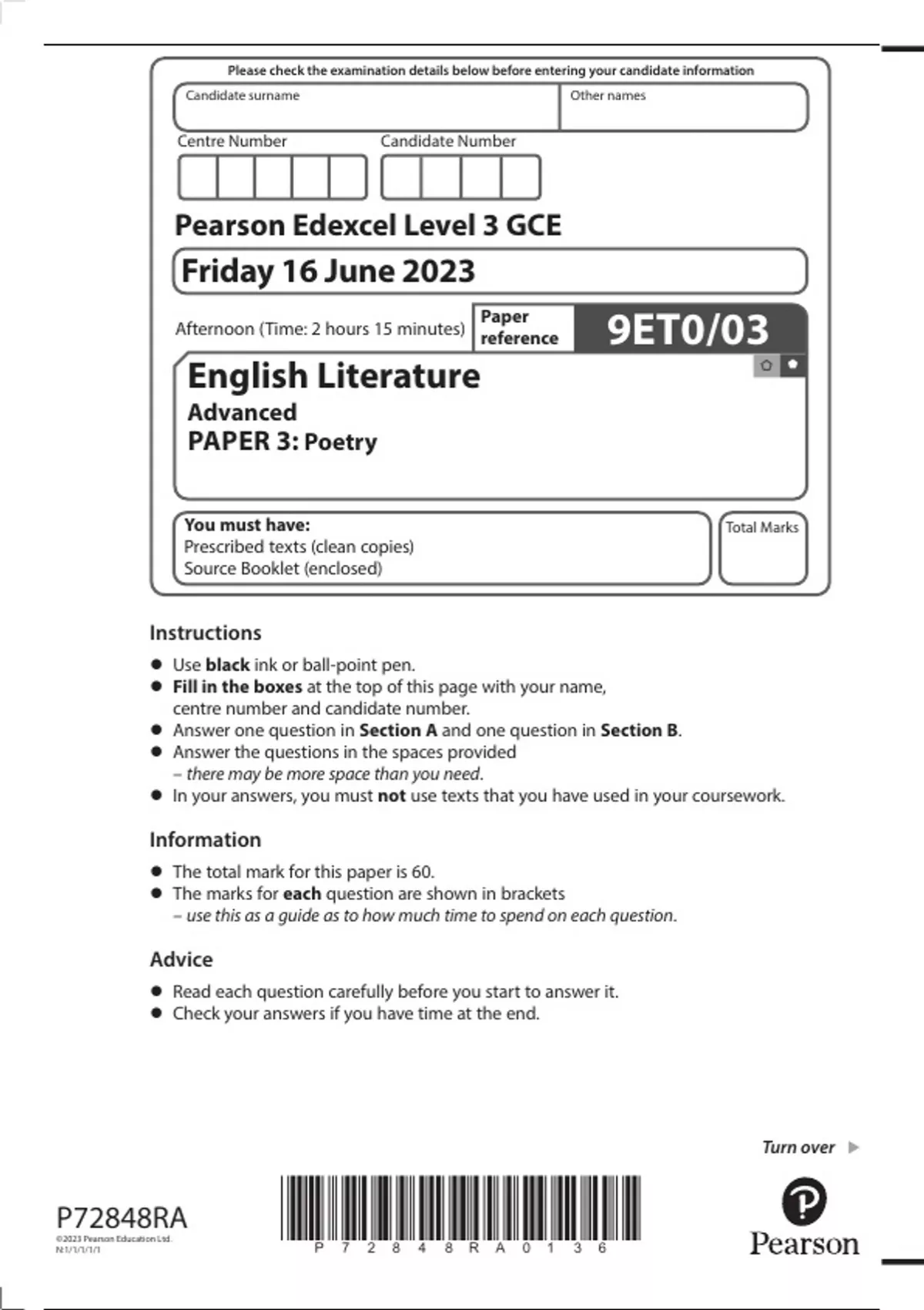 Pearson Edexcel GCE English Literature Advanced paper 3(9ET0/03:Poetry)QUESTION PAPER for June 2023