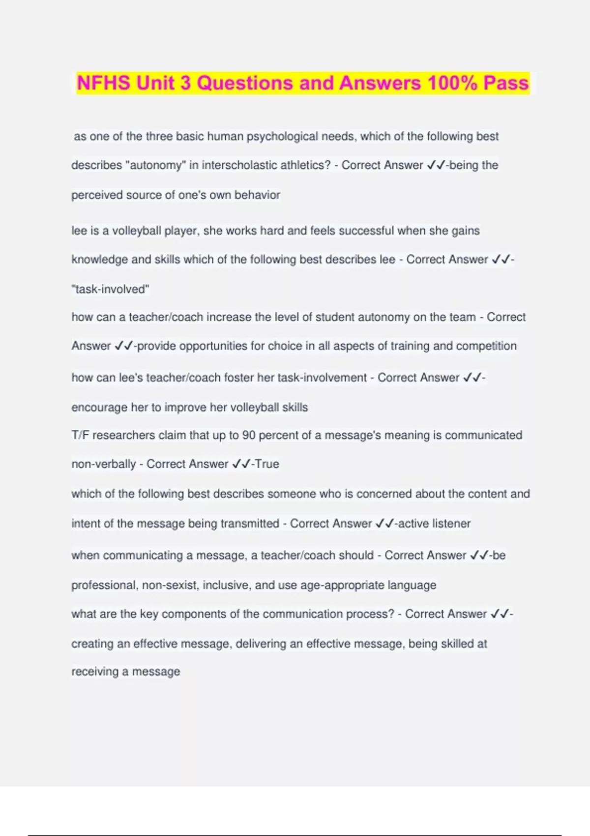 NFHS Unit 3 Questions and Answers 100% Pass as one of the three basic human psychological needs, which of the following best describes "autonomy" in interscholastic athletics? - Correct Answer ️️ -being the perceived source of one's own behavior lee is a volleyball player, she works hard and feels successful when she gains knowledge and skills which of the following best describes lee - Correct Answer ️️ - "task-involved" how can a teacher/coach increase the level of student autonomy on the team - Correct Answer ️️ -provide opportunities for choice in all aspects of training and competition how can lee's teacher/coach foster her task-involvement - Correct Answer ️️ - encourage her to improve her volleyball skills T/F researchers claim that up to 90 percent of a message's meaning is communicated non-verbally - Correct Answer ️️ -True which of the following best describes someone who is concerned about the content and intent of the message being transmitted - Correct Answer ️️ -active listener when communicating a message, a teacher/coach should - Correct Answer ️️ -be professional, non-sexist, inclusive, and use age-appropriate language what are the key components of the communication process? - Correct Answer ️️ - creating an effective message, delivering an effective message, being skilled at receiving a message T/F mistakes provide students feedback. If students are not making mistakes, then they are probably not maximizing their development - Correct Answer ️️ -True during batting practice, a teacher/coach tells a student to level