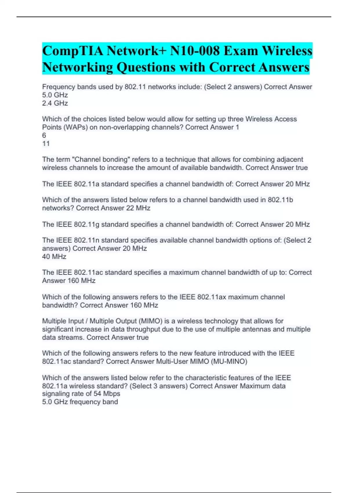 Frequency bands used by 802.11 networks include: (Select 2 answers) Correct Answer 5.0 GHz 2.4 GHz Which of the choices listed below would allow for setting up three Wireless Access Points (WAPs) on non-overlapping channels? Correct Answer 1 6 11 The term "Channel bonding" refers to a technique that allows for combining adjacent wireless channels to increase the amount of available bandwidth. Correct Answer true The IEEE 802.11a standard specifies a channel bandwidth of: Correct Answer 20 MHz Which of the answers listed below refers to a channel bandwidth used in 802.11b networks? Correct Answer 22 MHz The IEEE 802.11g standard specifies a channel bandwidth of: Correct Answer 20 MHz The IEEE 802.11n standard specifies available channel bandwidth options of: (Select 2 answers) Correct Answer 20 MHz 40 MHz The IEEE 802.11ac standard specifies a maximum channel bandwidth of up to: Correct Answer 160 MHz Which of the following answers refers to the IEEE 802.11ax maximum channel bandwidth? Correct Answer 160 MHz Multiple Input / Multiple Output (MIMO) is a wireless technology that allows for significant increase in data throughput due to the use of multiple antennas and multiple data streams. Correct Answer true Which of the following answers refers to the new feature introduced with the IEEE 802.11ac standard? Correct Answer Multi-User MIMO (MU-MINO) Which of the answers listed below refer to the characteristic features of the IEEE 802.11a wireless standard? (Select 3 answers) Correct Answer Maximum data signaling rate of 54 Mbps 5.0 GHz frequency band
