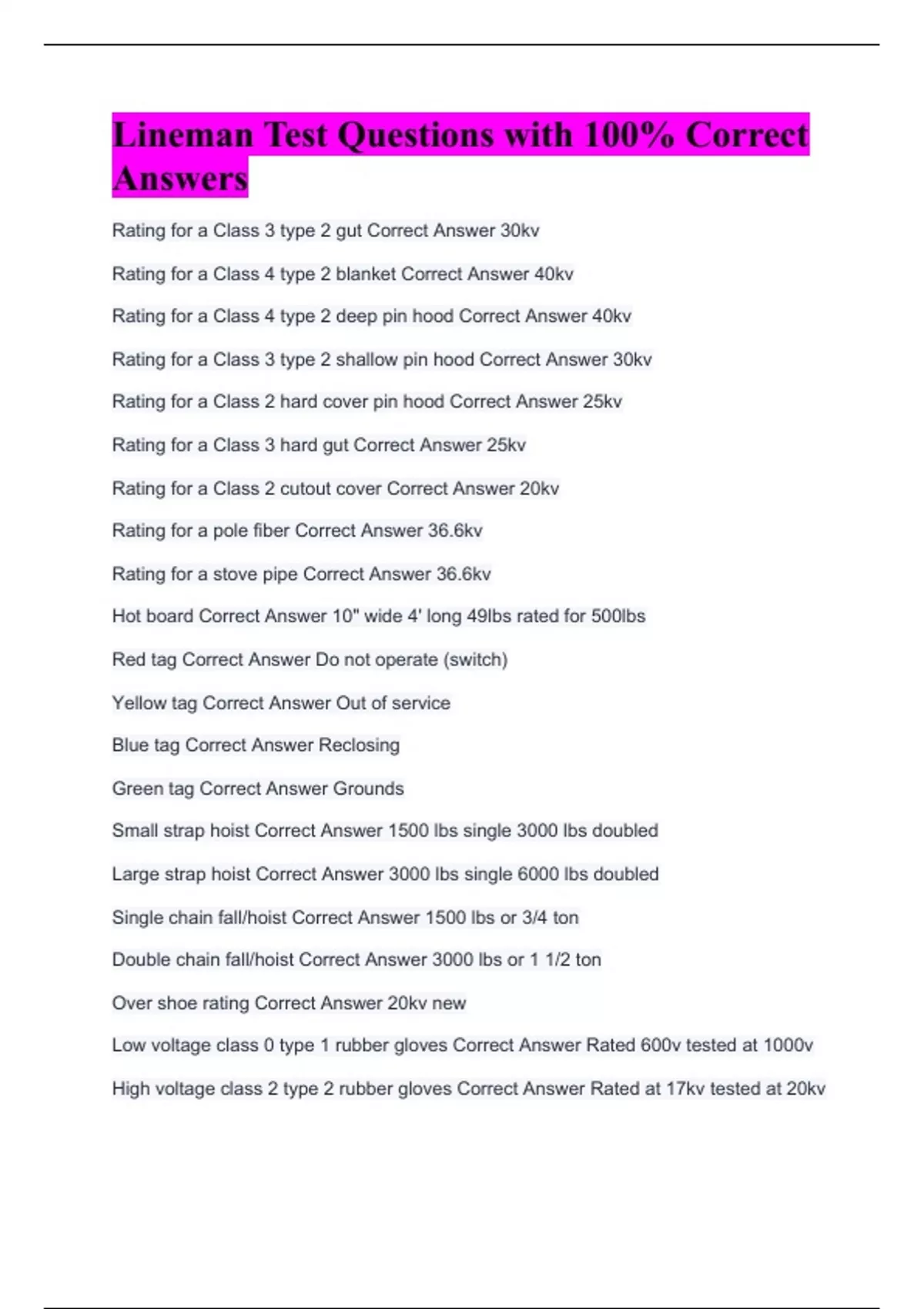 Rating for a Class 3 type 2 gut Correct Answer 30kv Rating for a Class 4 type 2 blanket Correct Answer 40kv Rating for a Class 4 type 2 deep pin hood Correct Answer 40kv Rating for a Class 3 type 2 shallow pin hood Correct Answer 30kv Rating for a Class 2 hard cover pin hood Correct Answer 25kv Rating for a Class 3 hard gut Correct Answer 25kv Rating for a Class 2 cutout cover Correct Answer 20kv Rating for a pole fiber Correct Answer 36.6kv Rating for a stove pipe Correct Answer 36.6kv Hot board Correct Answer 10" wide 4' long 49lbs rated for 500lbs Red tag Correct Answer Do not operate (switch) Yellow tag Correct Answer Out of service Blue tag Correct Answer Reclosing Green tag Correct Answer Grounds Small strap hoist Correct Answer 1500 lbs single 3000 lbs doubled Large strap hoist Correct Answer 3000 lbs single 6000 lbs doubled Single chain fall/hoist Correct Answer 1500 lbs or 3/4 ton Double chain fall/hoist Correct Answer 3000 lbs or 1 1/2 ton Over shoe rating Correct Answer 20kv new Low voltage class 0 type 1 rubber gloves Correct Answer Rated 600v tested at 1000v High voltage class 2 type 2 rubber gloves Correct Answer Rated at 17kv tested at 20kv