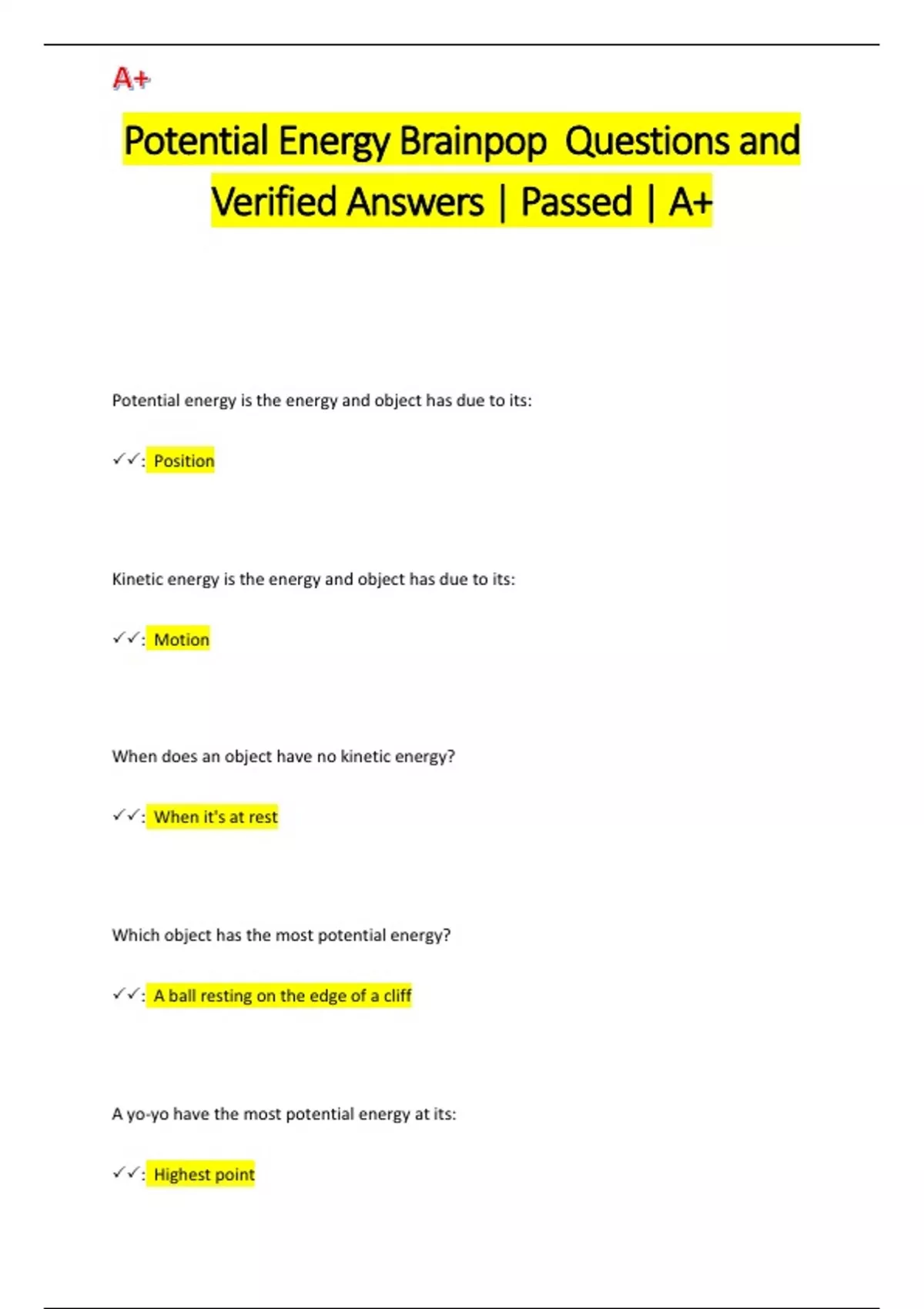 Potential Energy Brainpop Questions and Verified Answers | Passed | A+