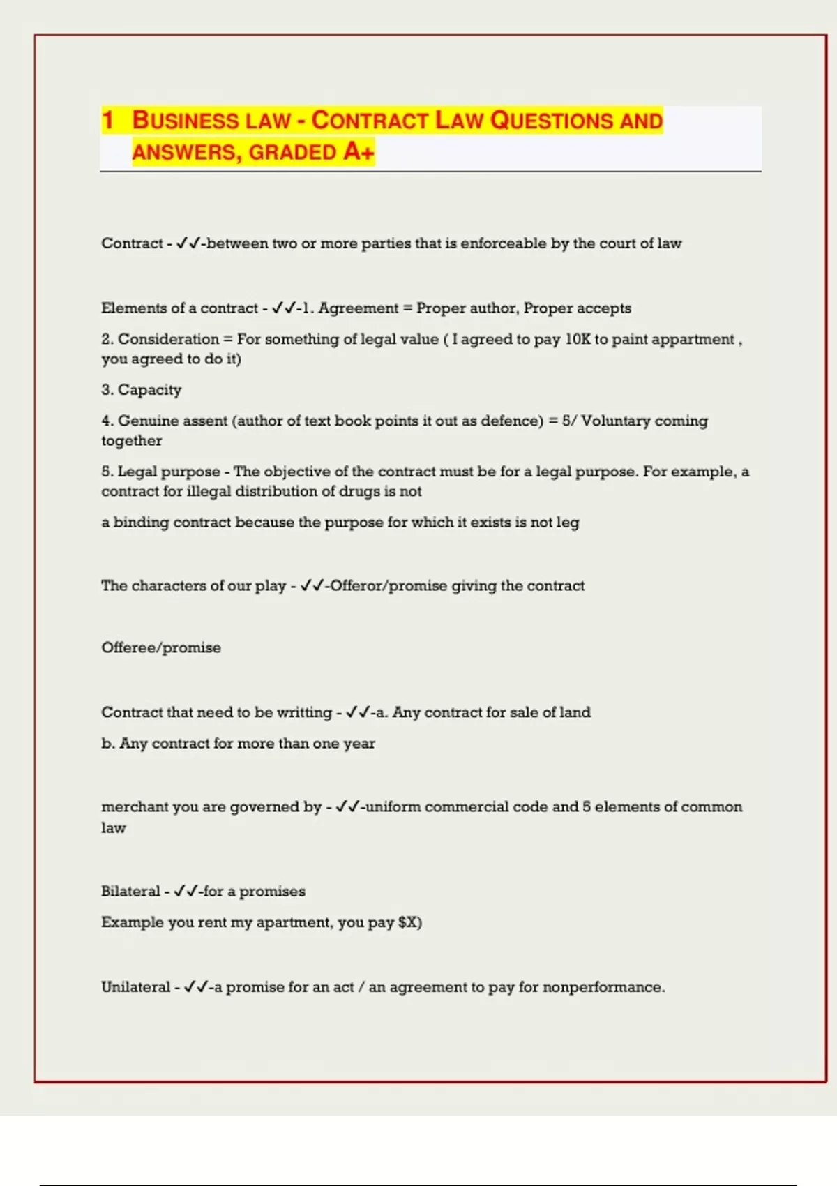 BUSINESS LAW - CONTRACT LAW QUESTIONS AND ANSWERS, GRADED A+ Contract - -between two or more parties that is enforceable by the court of law Elements of a contract - -1. Agreement = Proper author, Proper accepts 2. Consideration = For something of legal value ( I agreed to pay 10K to paint appartment , you agreed to do it) 3. Capacity 4. Genuine assent (author of text book points it out as defence) = 5/ Voluntary coming together 5. Legal purpose - The objective of the contract must be for a legal purpose. For example, a contract for illegal distribution of drugs is not a binding contract because the purpose for which it exists is not leg The characters of our play - -Offeror/promise giving the contract Offeree/promise Contract that need to be writting - -a. Any contract for sale of land b. Any contract for more than one year merchant you are governed by - -uniform commercial code and 5 elements of common law Bilateral - -for a promises Example you rent my apartment, you pay $X) Unilateral - -a promise for an act / an agreement to pay for nonperformance. Example: Rewards, I will pay you $1,000 if you bring my car from Cleveland to San Francisco." Bringing the car is acceptance. Formal contract - -Use guide lines based on a industry or formalized contract on court. Executed - -completed contract executory - -Something not yet performed or done. Examples: an executory contract is one in which all or part of the required performance has not been done; an executory bequest is a gift under a will which has not been distributed to the beneficiary Standard used by court to determine whether a contract is valid - -Reasonable person stadnard Valid contract - -enforceable binding co