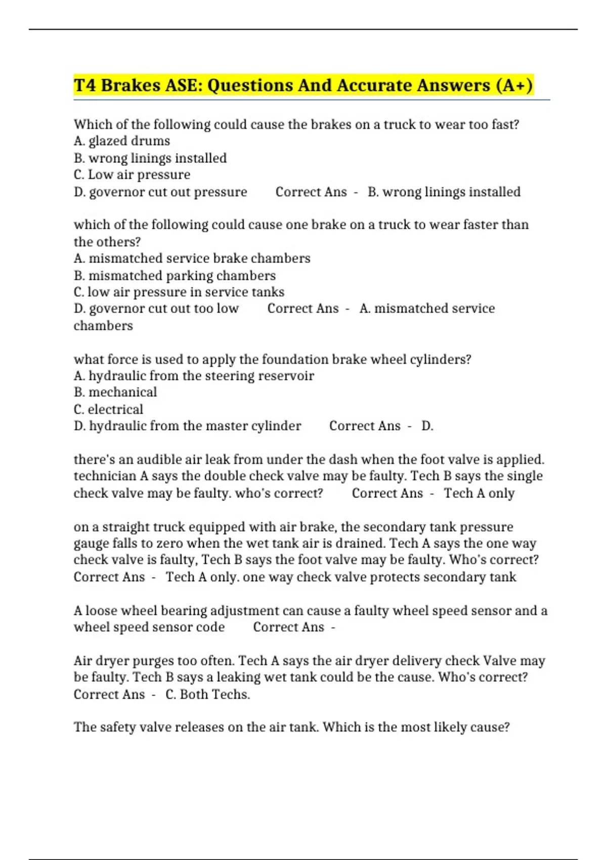 T4 Brakes ASE: Questions And Accurate Answers (A+)