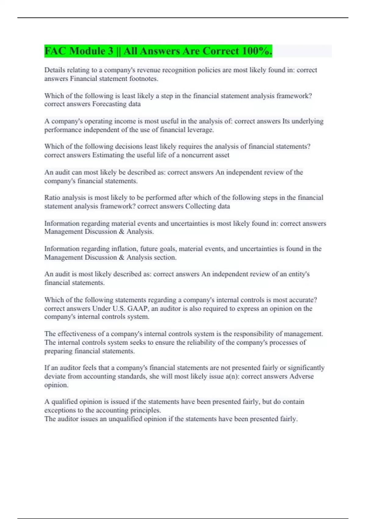 Details relating to a company's revenue recognition policies are most likely found in: correct answers Financial statement footnotes. Which of the following is least likely a step in the financial statement analysis framework? correct answers Forecasting data A company's operating income is most useful in the analysis of: correct answers Its underlying performance independent of the use of financial leverage. Which of the following decisions least likely requires the analysis of financial statements? correct answers Estimating the useful life of a noncurrent asset An audit can most likely be described as: correct answers An independent review of the company's financial statements. Ratio analysis is most likely to be performed after which of the following steps in the financial statement analysis framework? correct answers Collecting data Information regarding material events and uncertainties is most likely found in: correct answers Management Discussion & Analysis. Information regarding inflation, future goals, material events, and uncertainties is found in the Management Discussion & Analysis section. An audit is most likely described as: correct answers An independent review of an entity's financial statements. Which of the following statements regarding a company's internal controls is most accurate? correct answers Under U.S. GAAP, an auditor is also required to express an opinion on the company's internal controls system. The effectiveness of a company's internal controls system is the responsibility of management. The internal controls system seeks to ensure the reliability of the company's processes of preparing financial statements. If an auditor feels that a company's financial statements are not presented fairly or significantly deviate from accounting standards, she will most likely issue a(n): correct answers Adverse opinion. A qualified opinion is issued if the statements have been presented fairly, but do contain exceptions to the accounting principles. The auditor issues an unqualified opinion if the statements have been presented fairly.