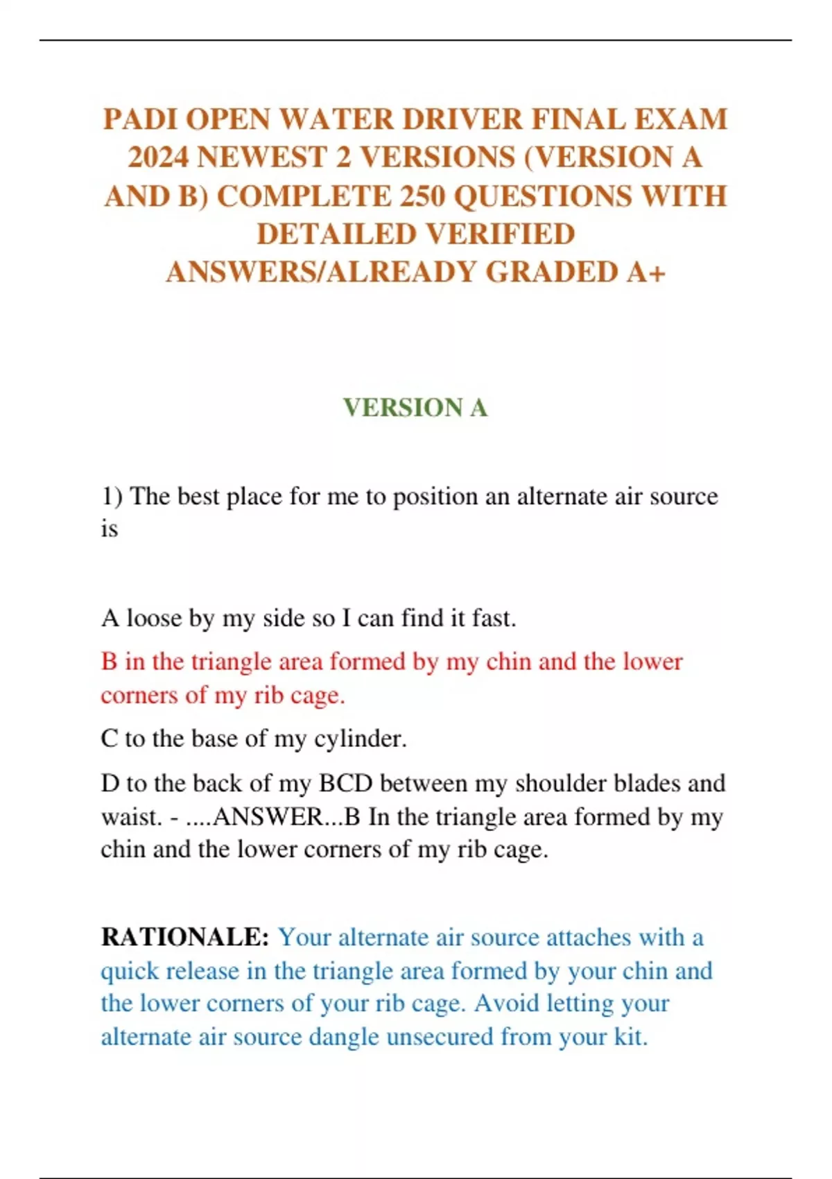 PADI OPEN WATER DRIVER FINAL EXAM 2024 NEWEST 2 VERSIONS (VERSION A AND B) COMPLETE 250 QUESTIONS WITH DETAILED VERIFIED ANSWERS/ALREADY GRADED A+