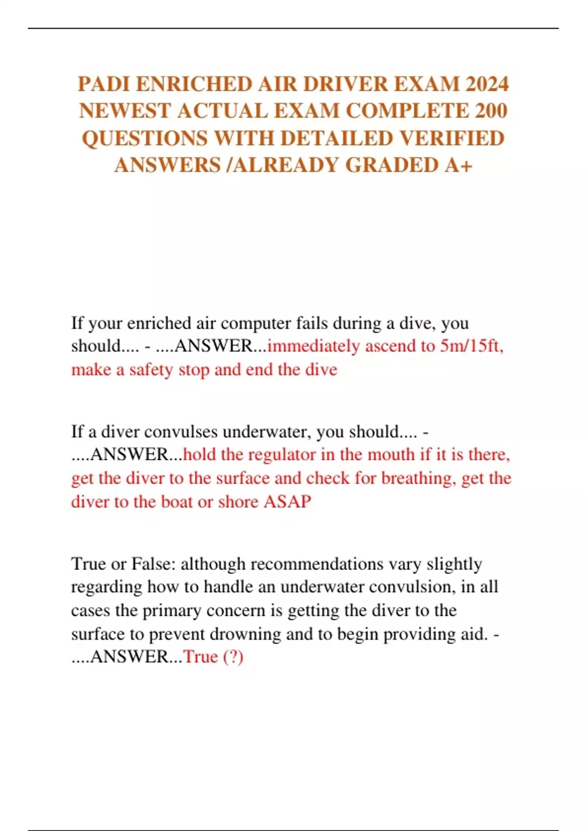 PADI ENRICHED AIR DRIVER EXAM 2024 NEWEST ACTUAL EXAM COMPLETE 200 QUESTIONS WITH DETAILED VERIFIED ANSWERS /ALREADY GRADED A+