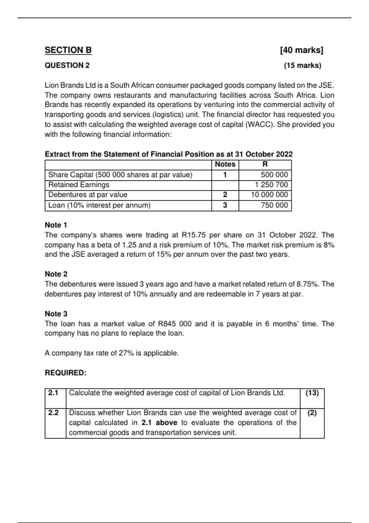 2.1 Calculate the weighted average cost of capital of Lion Brands Ltd. (13)