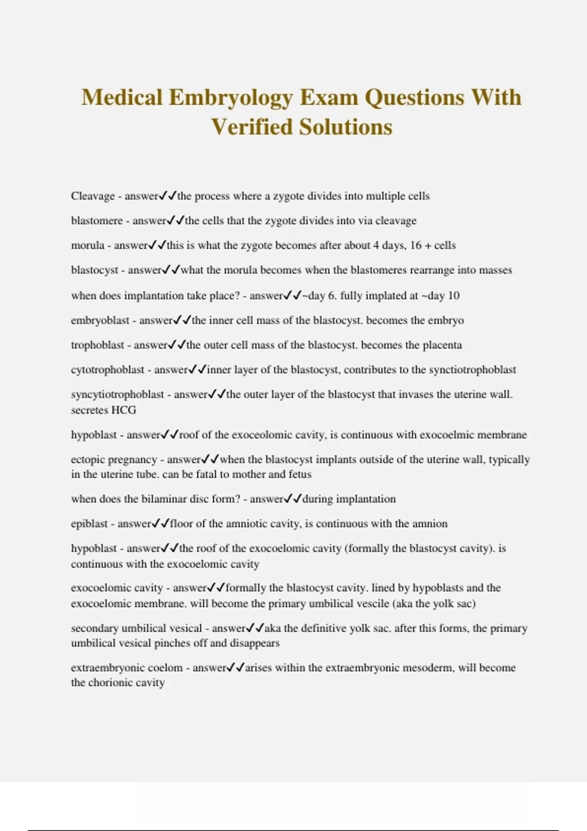 Medical Embryology Exam Questions With Verified Solutions Cleavage - answerthe process where a zygote divides into multiple cells blastomere - answerthe cells that the zygote divides into via cleavage morula - answerthis is what the zygote becomes after about 4 days, 16 + cells blastocyst - answerwhat the morula becomes when the blastomeres rearrange into masses when does implantation take place? - answer~day 6. fully implated at ~day 10 embryoblast - answerthe inner cell mass of the blastocyst. becomes the embryo trophoblast - answerthe outer cell mass of the blastocyst. becomes the placenta cytotrophoblast - answerinner layer of the blastocyst, contributes to the synctiotrophoblast syncytiotrophoblast - answerthe outer layer of the blastocyst that invases the uterine wall. secretes HCG hypoblast - answerroof of the exoceolomic cavity, is continuous with exocoelmic membrane ectopic pregnancy - answerwhen the blastocyst implants outside of the uterine wall, typically in the uterine tube. can be fatal to mother and fetus when does the bilaminar disc form? - answerduring implantation epiblast - answerfloor of the amniotic cavity, is continuous with the amnion hypoblast - answerthe roof of the exocoelomic cavity (formally the blastocyst cavity). is continuous with the exocoelomic cavity exocoelomic cavity - answerformally the blastocyst cavity. lined by hypoblasts and the exocoelomic membrane. will become the primary umbilical vescile (aka the yolk sac) secondary umbilical vesical - answeraka the definitive yolk sac. after this forms, the primary umbilical vesical pinches off and disappears extraembryonic coelom - answerarises within the extraembryonic mesoderm, will become the chorionic cavity
