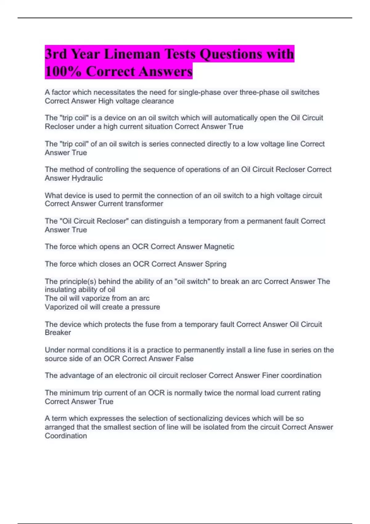 3rd Year Lineman Tests Questions with 100% Correct Answers