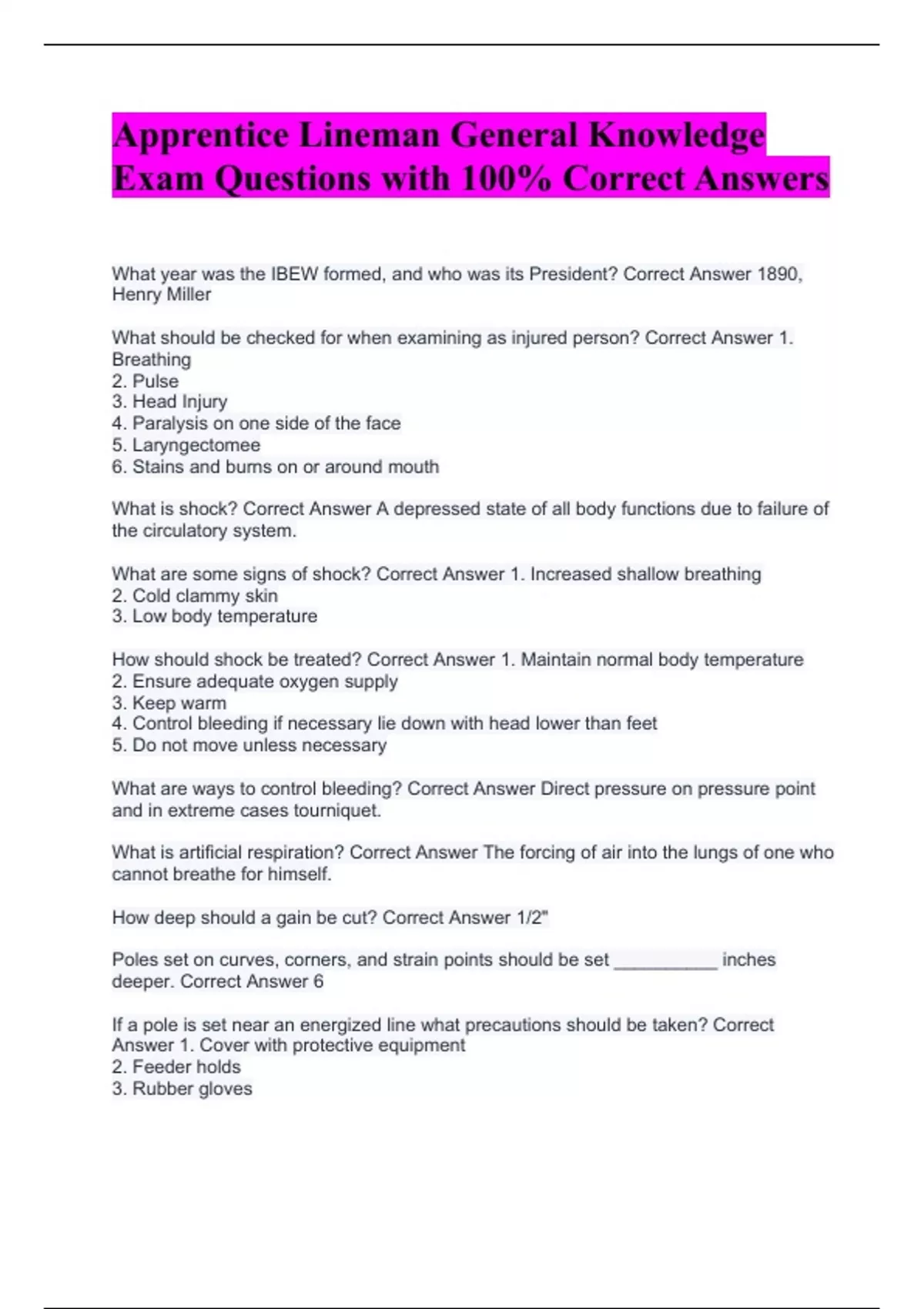 What year was the IBEW formed, and who was its President? Correct Answer 1890, Henry Miller What should be checked for when examining as injured person? Correct Answer 1. Breathing 2. Pulse 3. Head Injury 4. Paralysis on one side of the face 5. Laryngectomee 6. Stains and burns on or around mouth What is shock? Correct Answer A depressed state of all body functions due to failure of the circulatory system. What are some signs of shock? Correct Answer 1. Increased shallow breathing 2. Cold clammy skin 3. Low body temperature How should shock be treated? Correct Answer 1. Maintain normal body temperature 2. Ensure adequate oxygen supply 3. Keep warm 4. Control bleeding if necessary lie down with head lower than feet 5. Do not move unless necessary What are ways to control bleeding? Correct Answer Direct pressure on pressure point and in extreme cases tourniquet. What is artificial respiration? Correct Answer The forcing of air into the lungs of one who cannot breathe for himself. How deep should a gain be cut? Correct Answer 1/2" Poles set on curves, corners, and strain points should be set __________ inches deeper. Correct Answer 6 If a pole is set near an energized line what precautions should be taken? Correct Answer 1. Cover with protective equipment 2. Feeder holds 3. Rubber gloves Wood poles are classified by their: Correct Answer 1. Height 2. Top circumference 3. Circumference 6' from the bottom of the pole The denominator of an improper fraction is __________ than the numerator. Correct Answer smaller What materials do electrons travel freely through? Correct Answer conductors If few electrons travel freely through a material, that material is said to be an _________. Correct Answer insulator Is there such a thing as a perfect insulator? Correct Answer no The opposition to current flow through a material is called? Correct Answer resistance What is the unit of measurement of resistance? Correct Answer Ohm What is the resistance of 1000 feet of #10 copper? Correct Answer 1 Ohm What is electric current? Correct Answer The definite drift of electrons from a point of negative potential to a point of positive potential. The unit of measurement of electromotive force is the: Correct Answer Volt The unit of current flow is: Correct Answer Ampere In a circuit the current is __________ proportional to the voltage and __________ proportional to the resistance. Correct Answer directly, inversely The __________ at which work is done is power. The formula for this is: Correct Answer rate, Power = Work ÷ Time One joule of work done in one second of time is one __________ of electrical work. Correct Answer Watt The unit of electrical work is the __________ ? Correct Answer Joule The unit of electrical power is the __________ ? Correct Answer Watt __________ is the unit of measurement of work for mechanical power. Correct Answer Horsepower What is the most common cause for lost power? Correct Answer heat How many watts are in one horsepower? Correct Answer 746