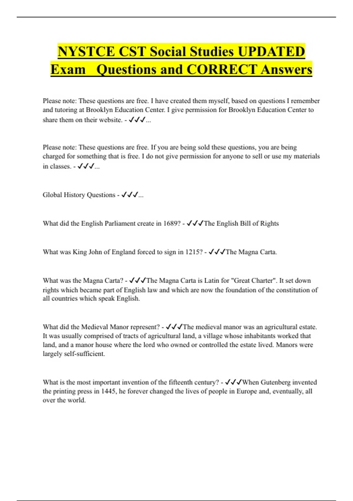 Please note: These questions are free. I have created them myself, based on questions I remember and tutoring at Brooklyn Education Center. I give permission for Brooklyn Education Center to share them on their website. - ... Please note: These questions are free. If you are being sold these questions, you are being charged for something that is free. I do not give permission for anyone to sell or use my materials in classes. - ... Global History Questions - ... What did the English Parliament create in 1689? - The English Bill of Rights