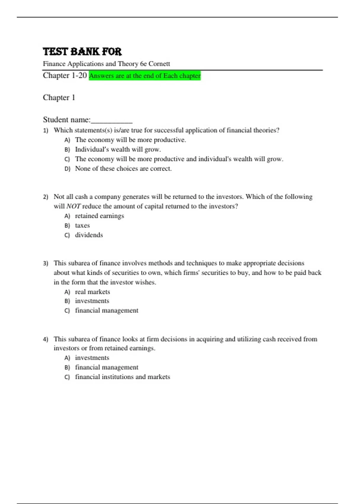 Test Bank for Finance: Applications and Theory 6e 6th Edition by Marcia Cornett, Troy Adair and John Nofsinger ISBN-13: 1580 Part One: Introduction Chapter 1: Introduction to Financial Management Part Two: Financial Statements Chapter 2: Reviewing Financial Statements Chapter 3: Analyzing Financial...